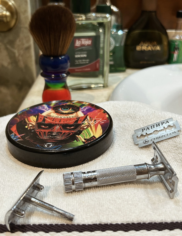 - Maquinilla: Merkur 34C HD. - Cuchilla: Rapira Super Stainless. - Brocha: Yaqi Arcoíris. - Jabón: Hags “Soberano de Barberías”. - Masaje: La Toja.