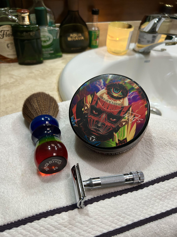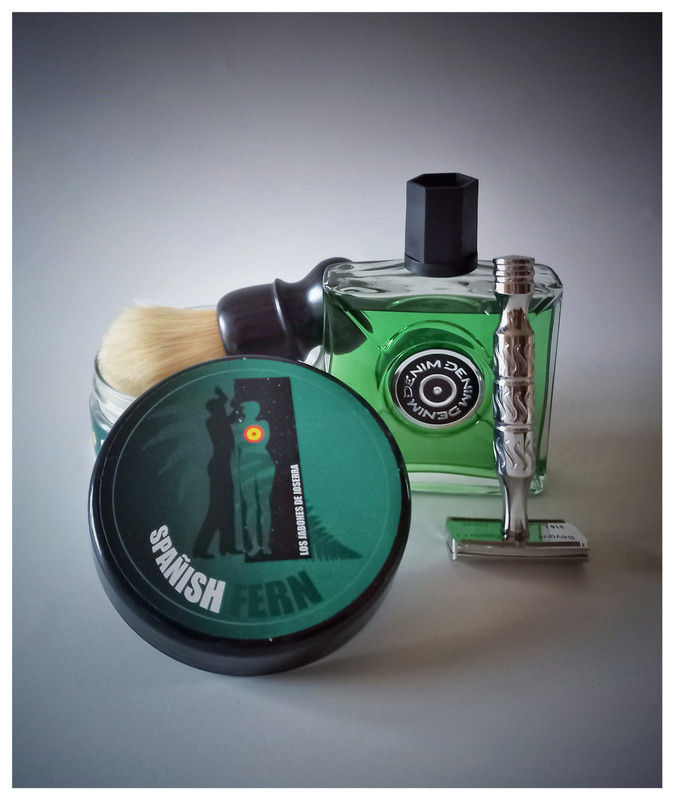 Brocha: Wolf Whiskers Wolf Whiskers SHD UOMO manchurian Maquinilla: EJ 89 Cuchilla: Solimo #3 Jabón: Ach Brito Lavanda Loción: Witsel&Co Lavanda