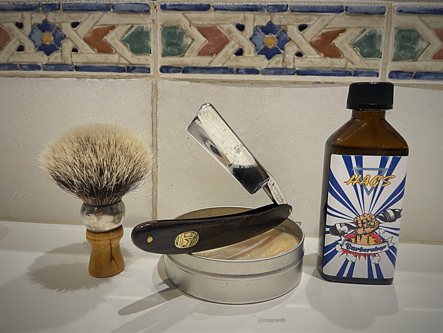 Esta estupenda base de Joserra ha producido una espuma muy espesa y protectora. La maquinilla monta un cabezal 89 que, o es el mejor clon que hay, o directamente es Mühle o Edwin Jagger. La loción muy buena, poco alcohólica.