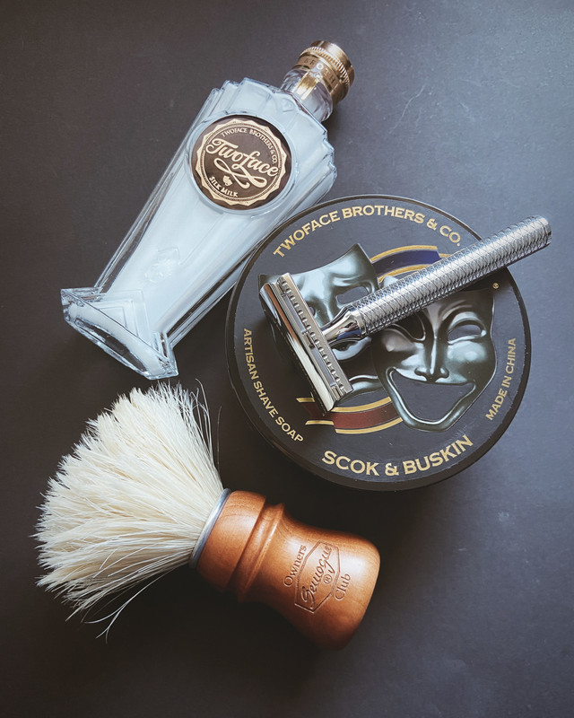Proraso, green cream preshave. Geo F Trumper, Spanish leather, shaving cream. ). Yaqi brush, synthetic hair 24 mm knot, moka express handle. Union 2500, carbon steel, wedge, spyke point, Japan.