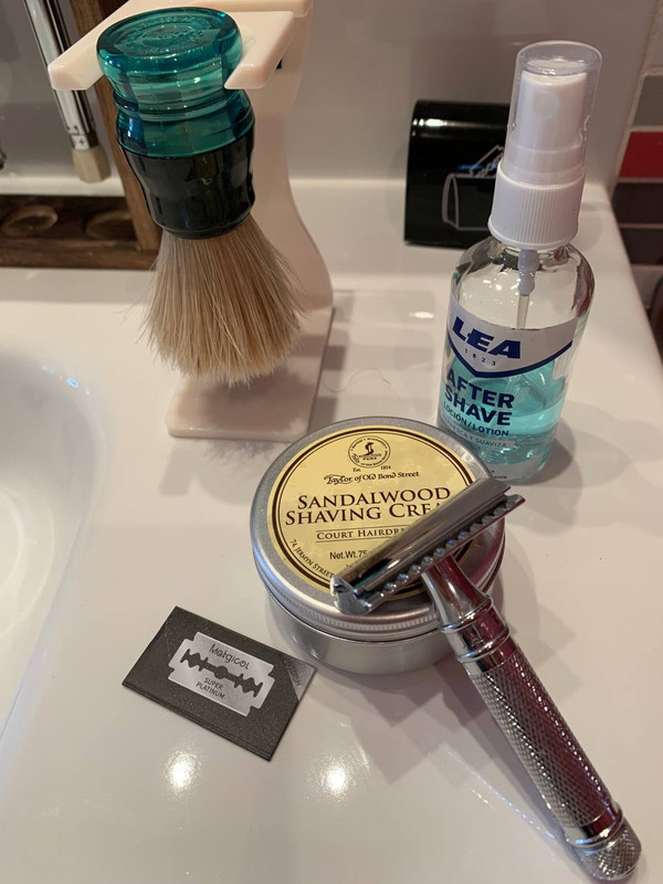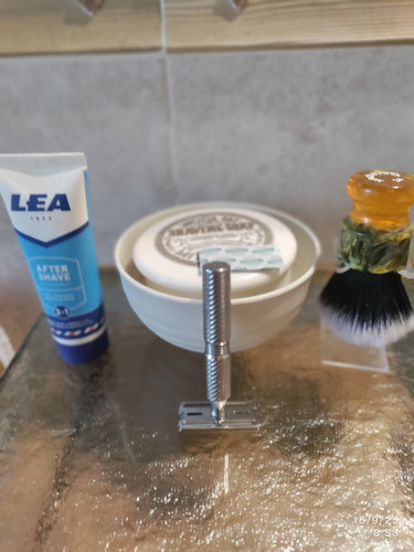 Hoy he variado el jabón, que es un Mitchells Wool Fat y la cuchilla y maquinilla son las mismas. La cuchilla es una Derby Premium al 2° uso.