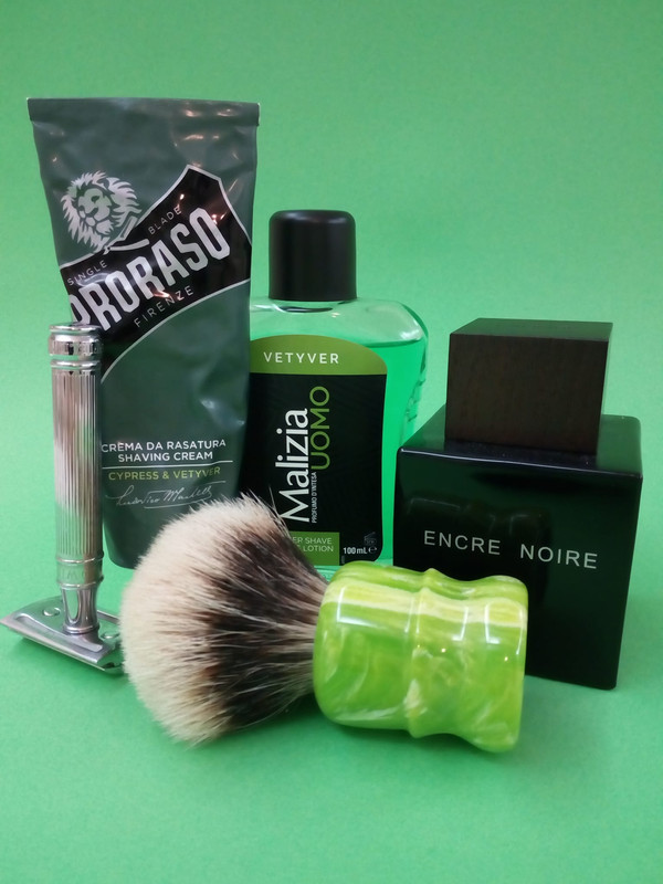 Proraso Cypress and Vetiver Shaving Cream // Highlander Brushes - GDMG SHD Manchurian Knot 24 mm // Edwin Jagger DE89LBL Razor // Personna Platinum Blade // AS Malizia Vetyver // Lalique Encre Noire EdT