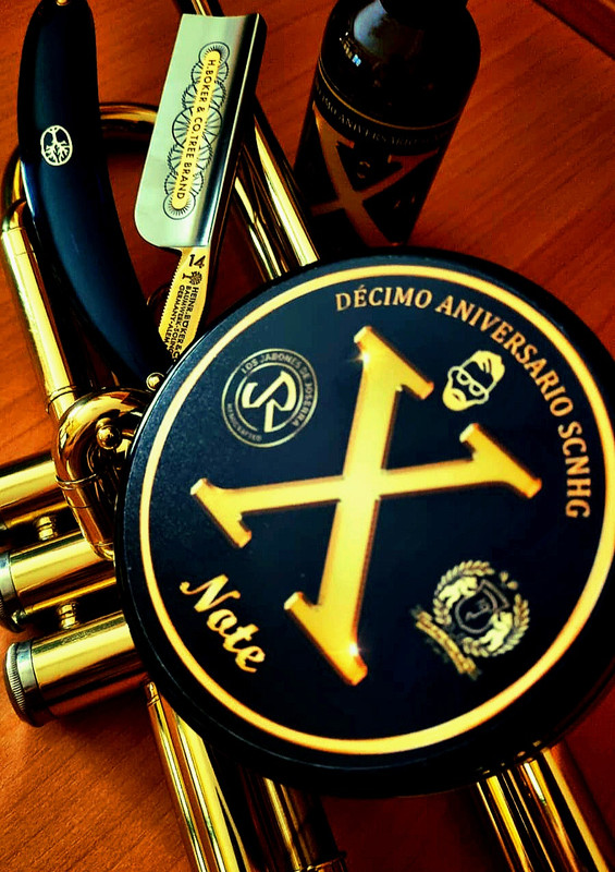 Pre: ducha agua tibia + jabón neutro. Jabón, aftwe y sérum: X Note Scnhg by Joserra y Daniel Josier. Navaja: Böker 14 extra hollow. Brocha: Yaqi Freedom26mm. Trompeta: Yamaha YTR-2330.