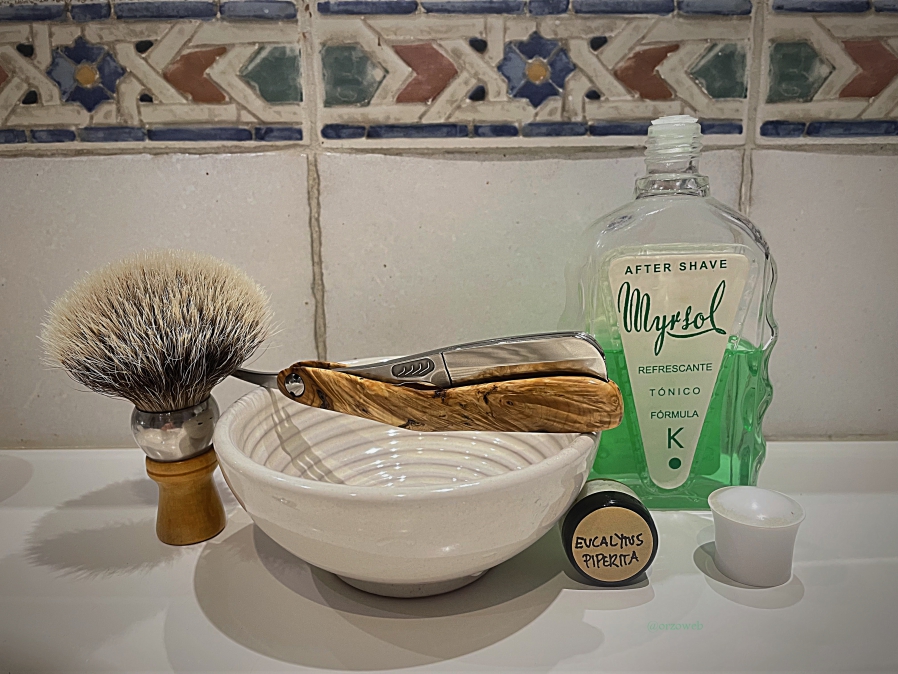 Lo habitual. Ducha caliente, espumado en cara, dos pasadas L/C y loción para terminar. Nada que no sepais ya. Cambian los materiales utilizados. Brocha Druida Danidom, jabón ABB, navaja de cuchileria Roca y Myrsol Plastic Shave. Buen apurado y un poco de irritación.