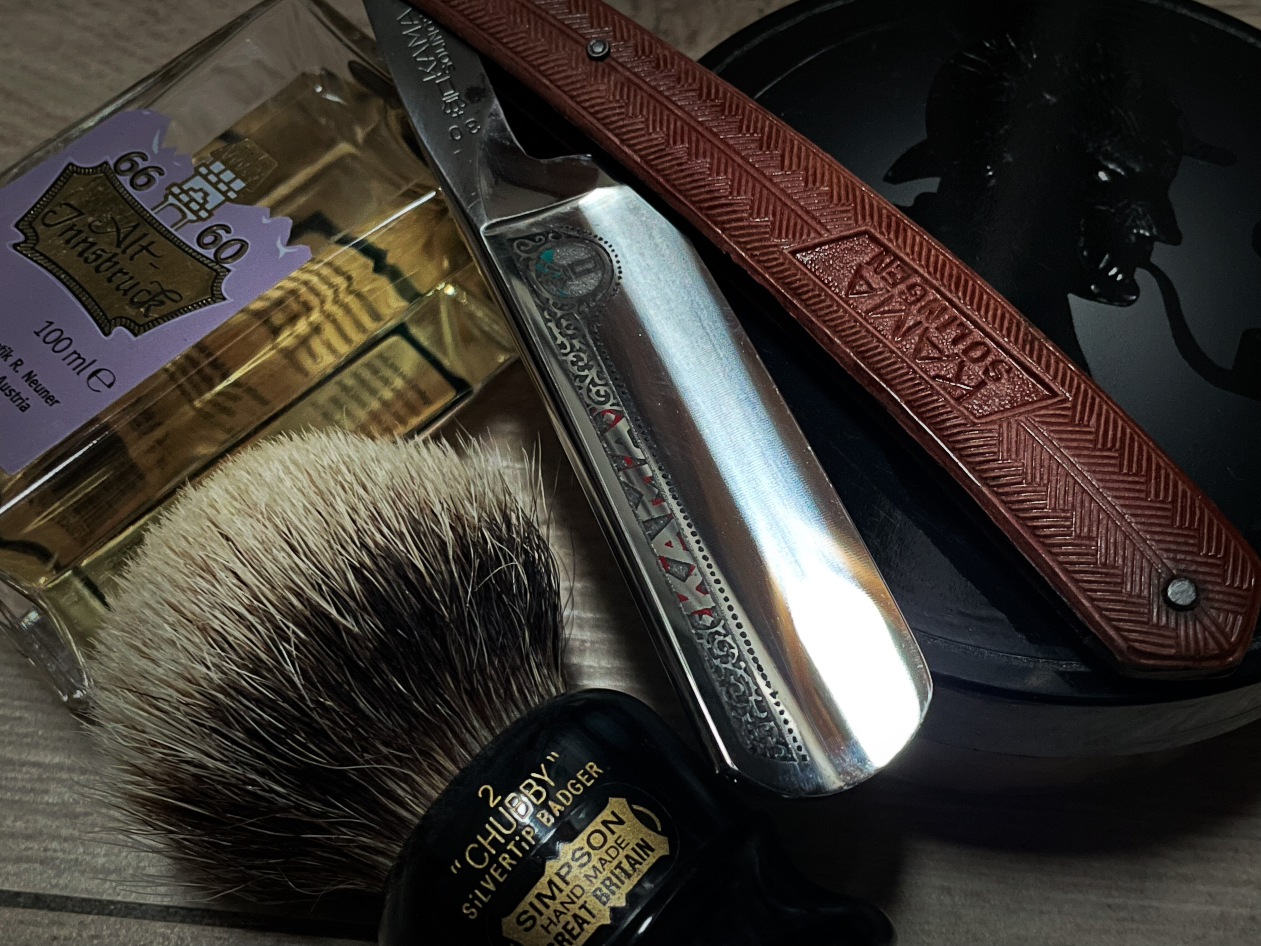 Floïd oil preshave. Fine Accoutrements, Látigo: Shaving soap & Lotion aftershave. Vie-Long 13063, white horse hair. Dovo, Bismarck, carbon steel 6/8, faux mother of pearl scales.
