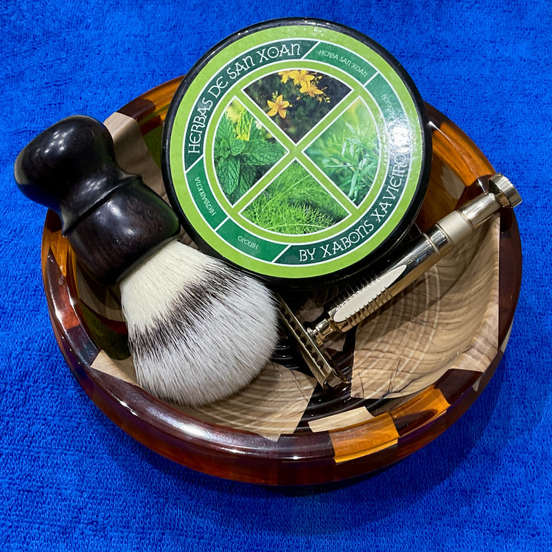 Hoy Botí N3C y este estupendo Herbas de San Xoan de @Xavieiro espumado en esta joya de bol de @Secaro. Un jabón fabuloso al que ya se le ve el fondo del bote, y que estoy disfrutando salvajemente este mes, y que volveré a repetir cuando se termine. Esta brocha de Botí es muy suave, y como todas las sintéticas espuma con una facilidad pasmosa. Así que me he dado un atracón de espuma importante.