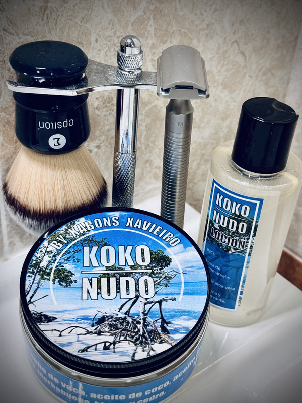 PRE: duchita buena : Epsilon sintética : Koko Nudo by @Xavieiro : Muhle Rocca R94 Cuchilla : Nacet Espumado : En cara Afeitado en 2 pases FC Espuma de Confort : Si Enjuague con agua fría After: loción Koko Nudo by Xavieiro
