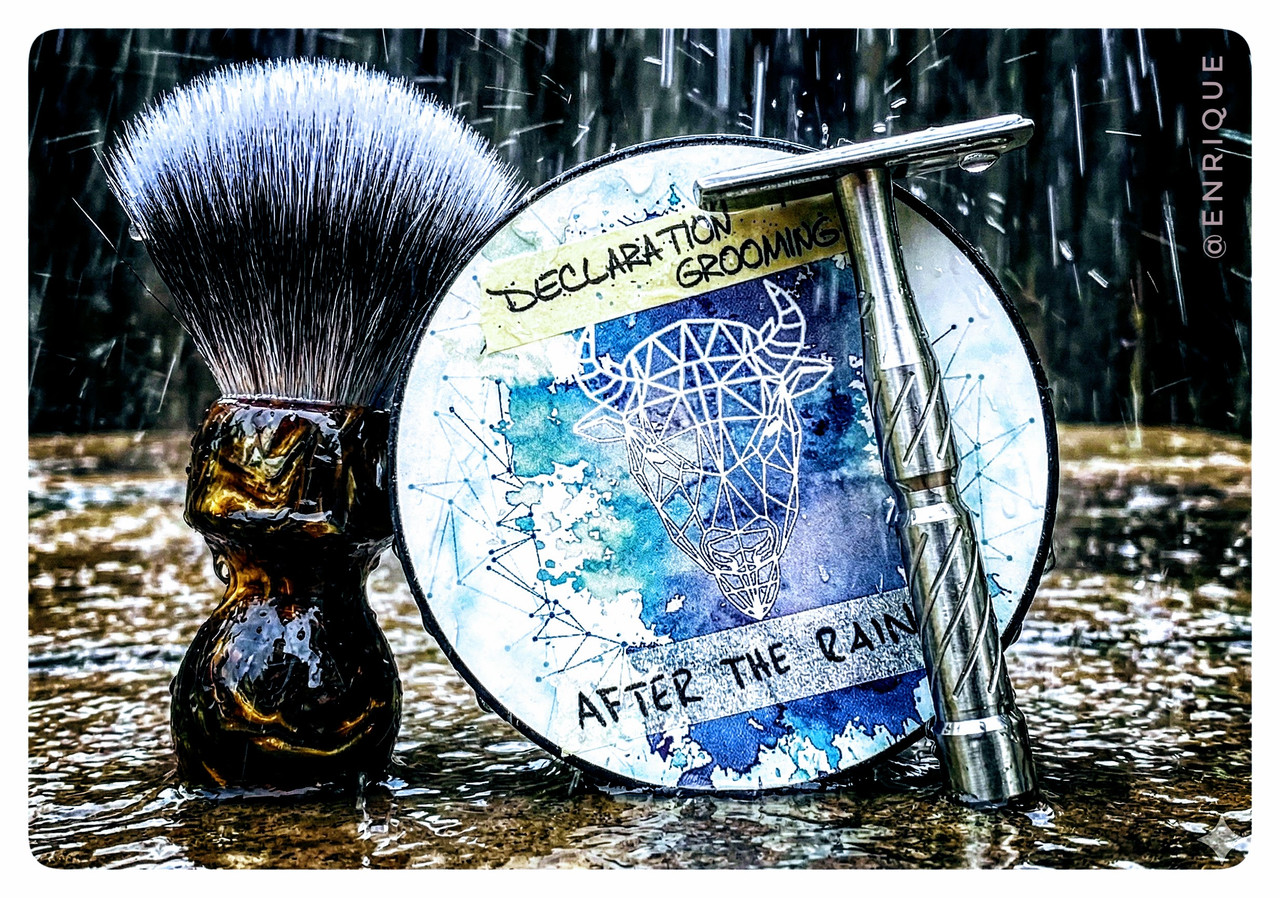 Buenos días…Llueve copiosamente, así que me afeito en consecuencia; elegir un Declaration Grooming siempre es acierto seguro. Este “After de Rain” posee un muy agradable aroma a naturaleza mojada…La Blackland Vector es, por su parte, una delicia, la mejor monofilo del mercado EMMO..