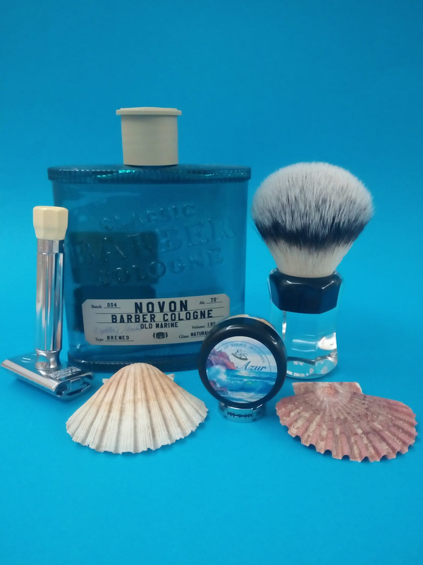 E&S Rasage Azur Shaving Soap // Yaqi Robin 24mm Sinty Brush // Merkur Progress 500 Razor // Personna Platinum Blade // Old Marine Classic Barber NOVON
