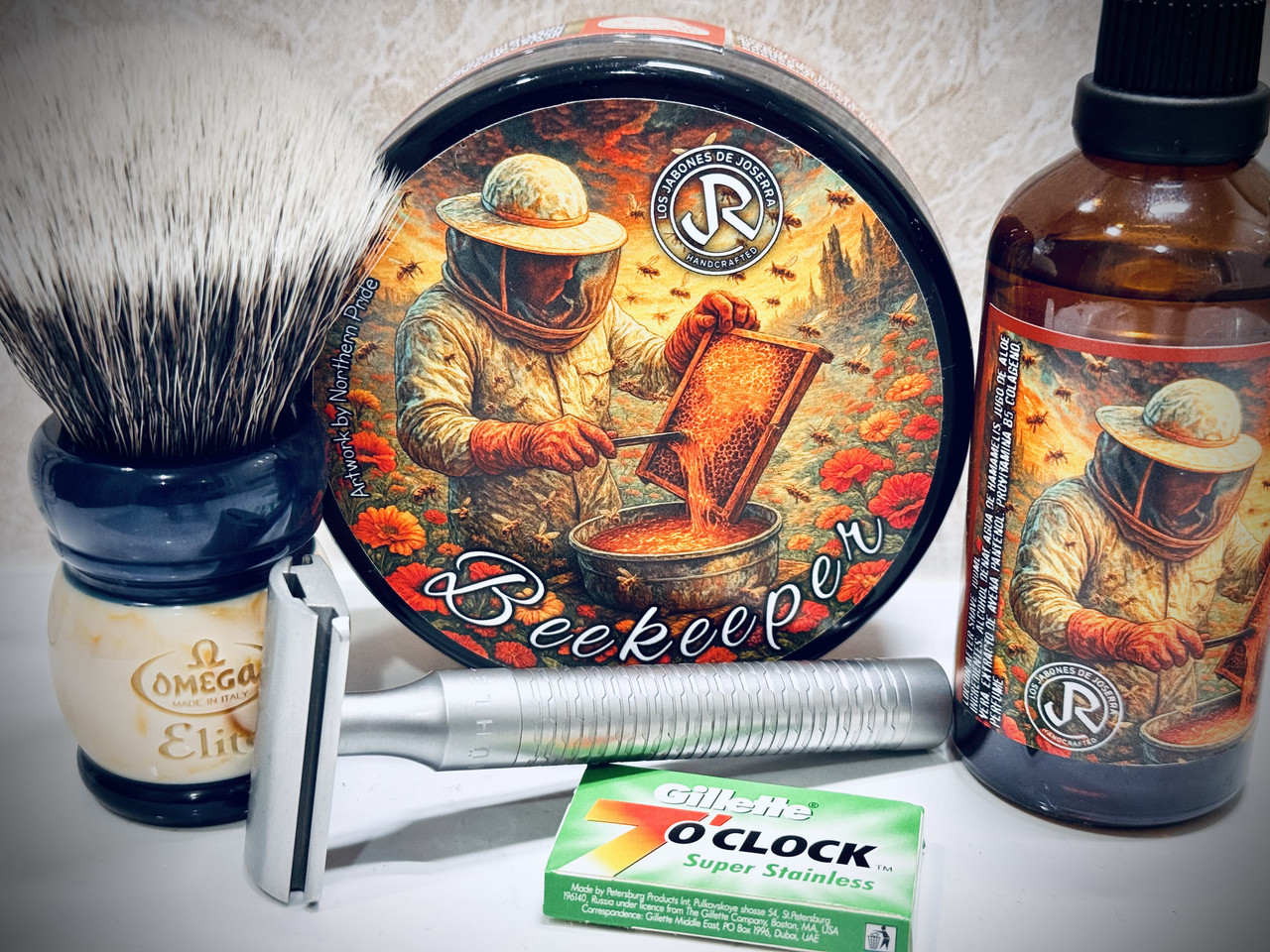 El de hoy… Uno de mis favoritos: BEEKEEPER. Esto no puede haber persona a la que no le guste. Hoy lo he disfrutado especialmente después del jaleo de estos días y me he tomado todo el tiempo que me ha dado la gana, después de una ducha caliente, espumando en cara, con suavidad, deleitándome con su olor, con el sonido después la brocha, intentando distinguir las notas… el afeitado igual, suave y sin prisas, disfrutando del deslizamiento, sintiendo como la maquinilla resbalaba por la piel, y escuchando la canción de la Rocca segando… envuelto en esta increíble fragancia. Me ha encantado la experiencia hoy.