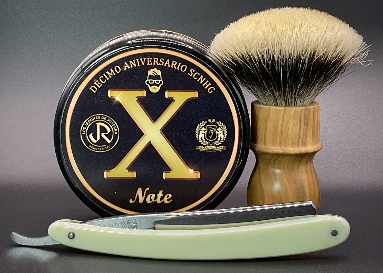 El de hace un momento. Repetimos con la Favorit 2000, pero con otros apechusques. El fantástico jabón del Décimo aniversario y brocha de Hanami con nudo de tejón. La japonesa suave pero implacable.