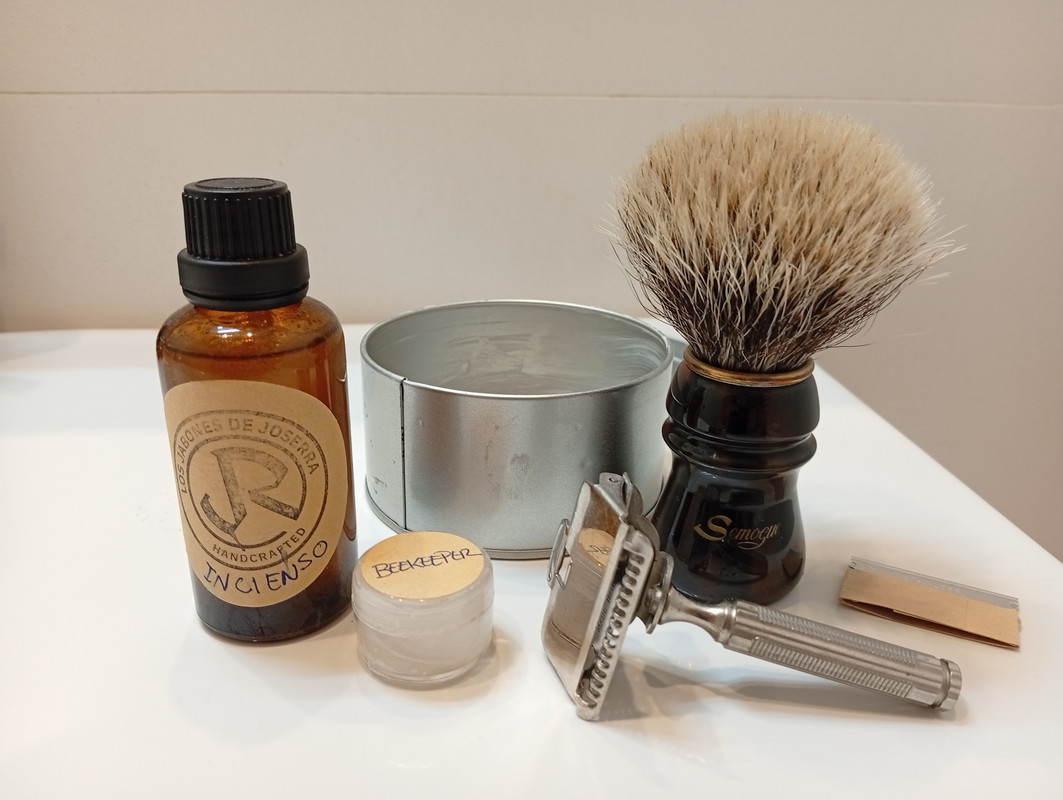 Muestras generosas de jabón Joserra Beekeper y loción Joserra Incienso. La magnífica calidad de siempre y muy buenos aromas. La Semogue del foro me está gustando mucho, y la Star siempre eficiente en estos afeitados con mucha barba.