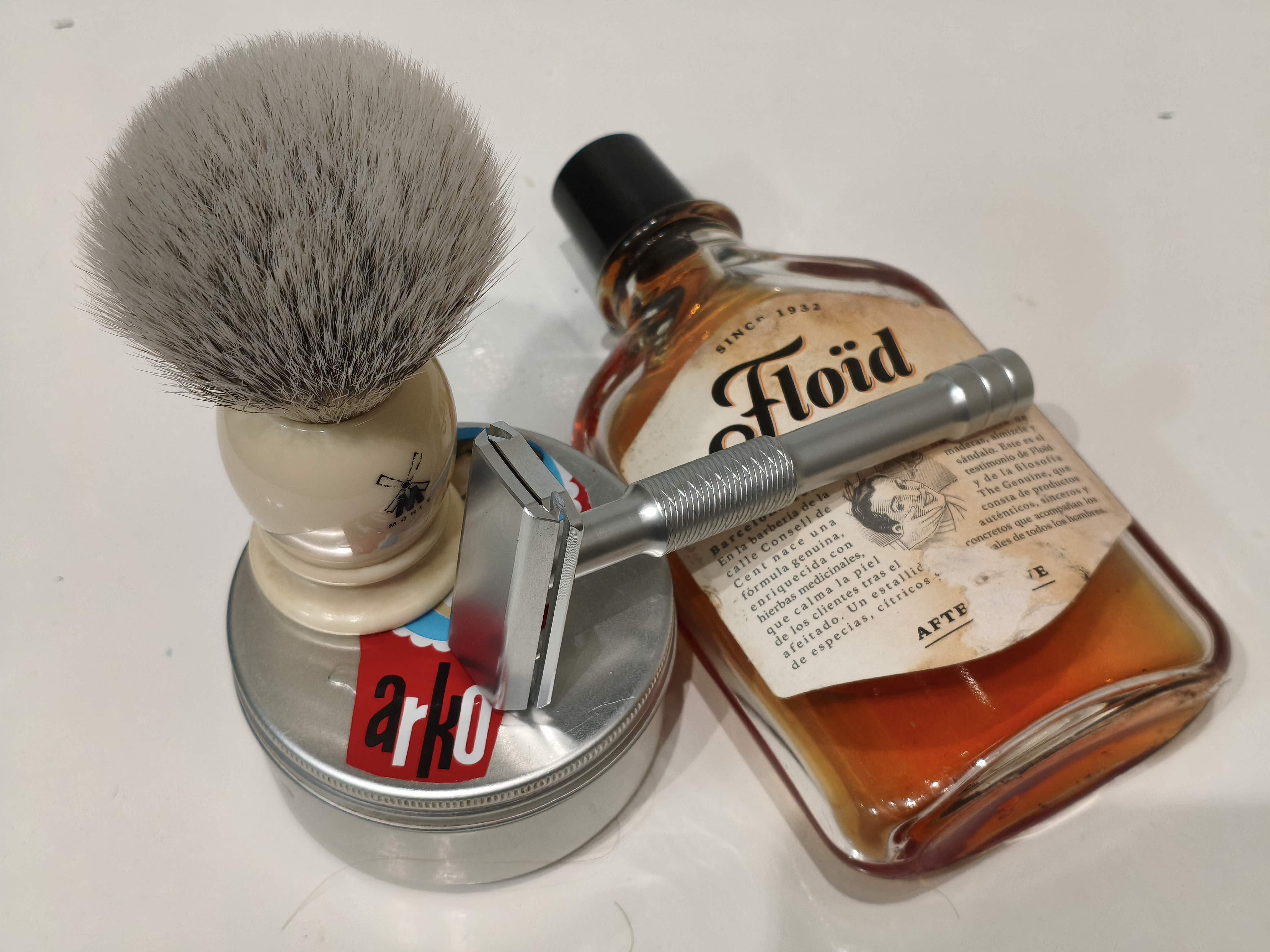 Película de agua templada sobre el jabón al llenar el lavabo, navaja al cuero, escurro brocha, agua jabonosa a la cara y 4 o 5 vueltas a la brocha en casa sentido