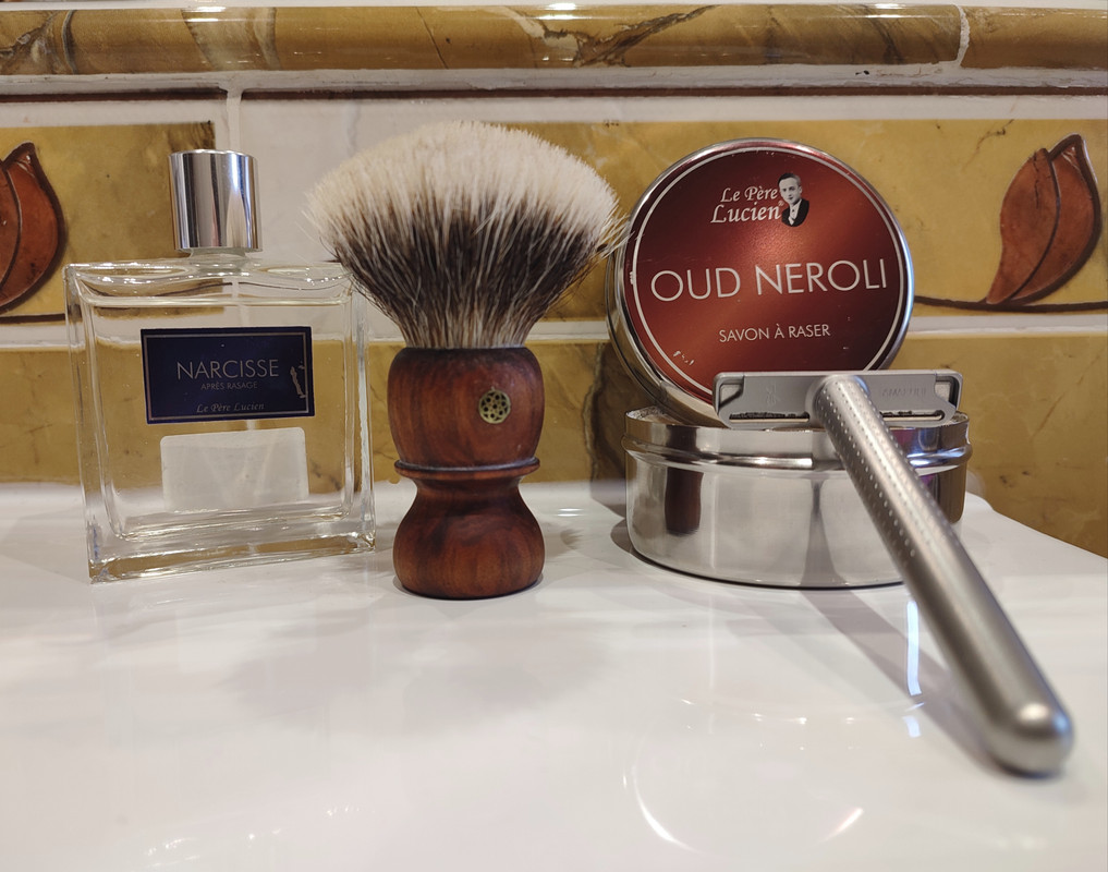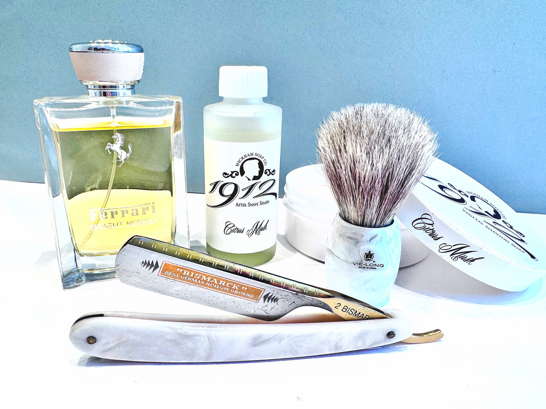 Ach Brito sabonete de glicerina, lima, ore shave. Wickham Soap Co., Citrus musk, shaving soap & Lotion aftershave. Vie-Long 14830 Mix Badger and Horse hair, 24 mm knot, white acrylc handle. Dovo, Bismarck, 6/8, acrylic pearl scales. Ferrari, Bright neroli, EdT.