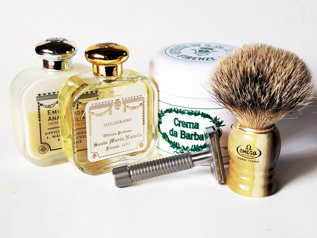 Maquinilla: Rex Envoy Cuchilla: Wizamet SI #1 Brocha: Omega 620 Super badger Jabón: Crema da barba Santa Maria Novella Post-afeitado: Espuma de confort, Emulsione Analcolica SMN Perfume: Melograno SMN