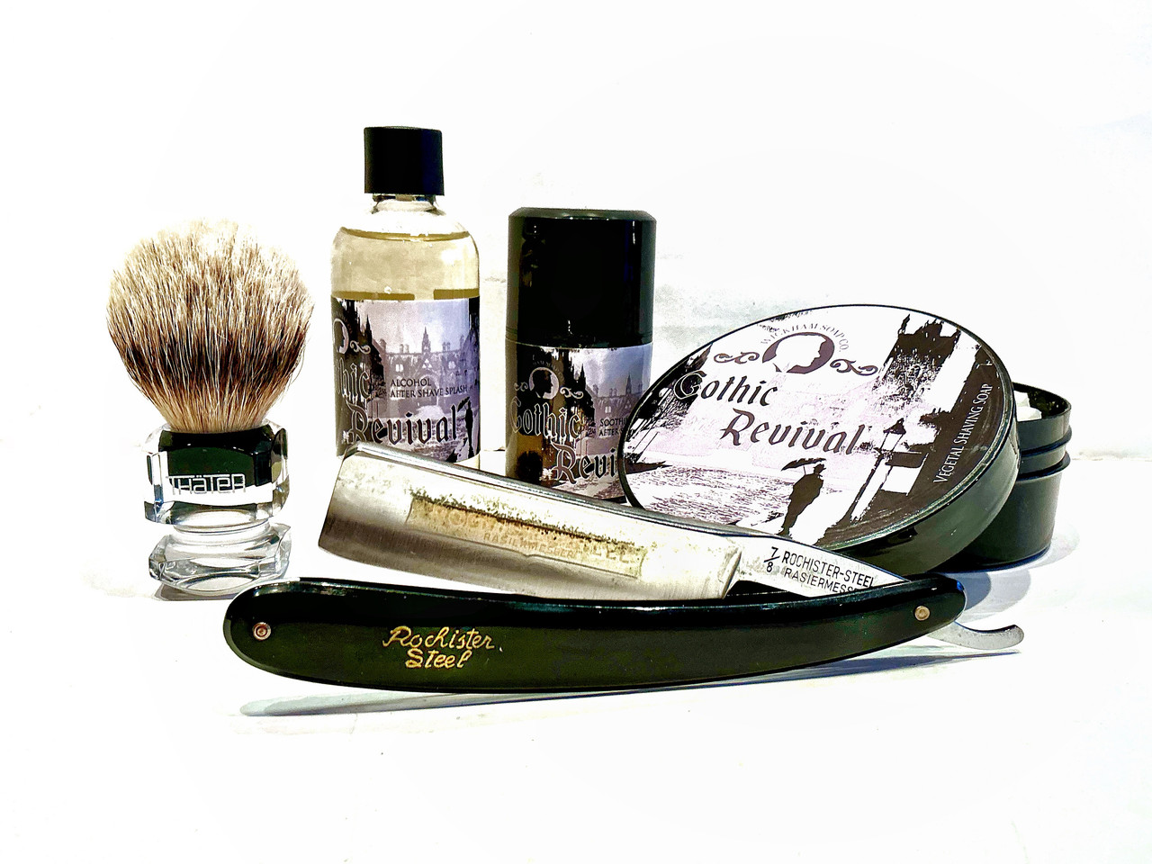 Floïd oil preshave. Gothic Revival, Shaving soap, lotion & balm aftershave. Thäter, Rein-Dach, plexi swarz. Rochister Steel, 7/8.