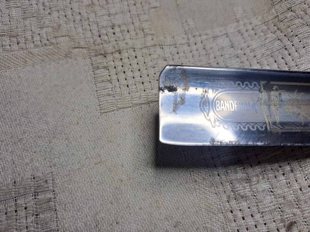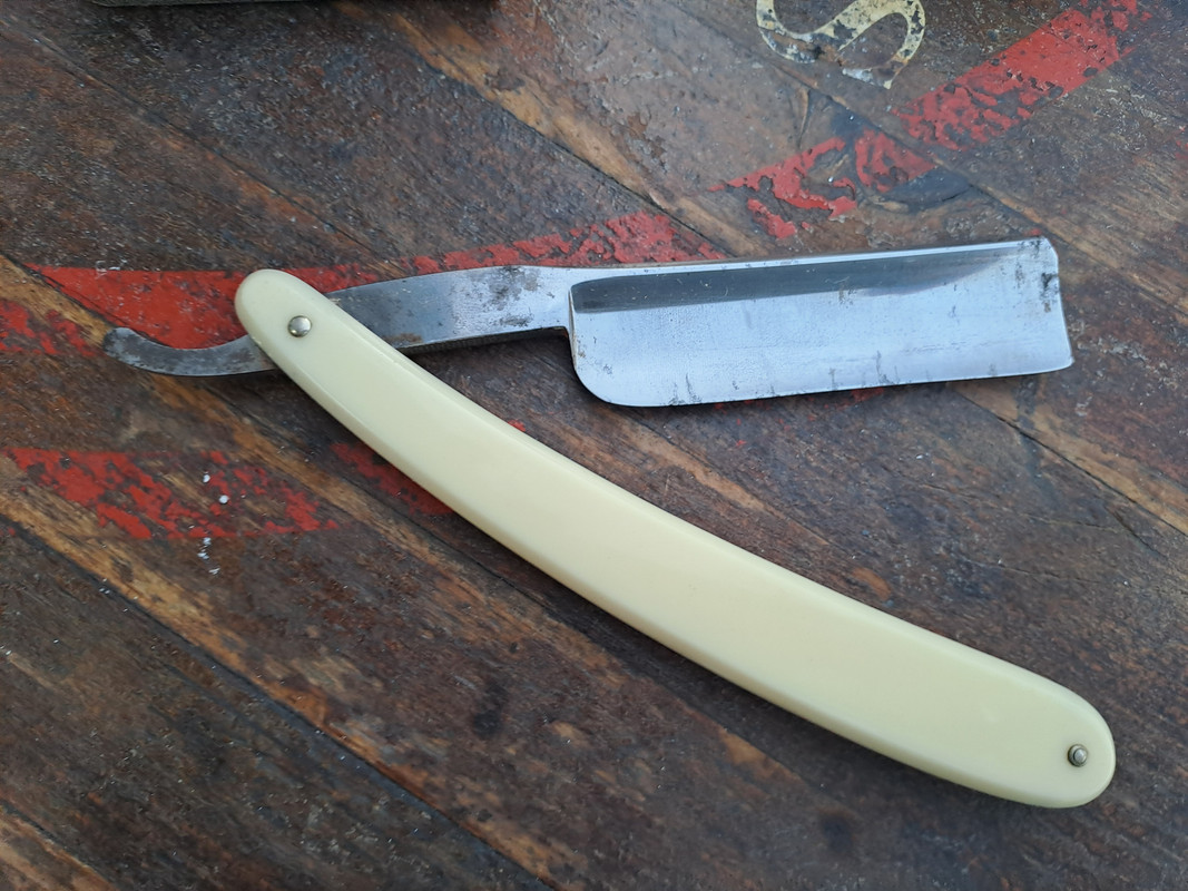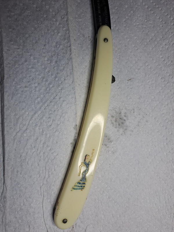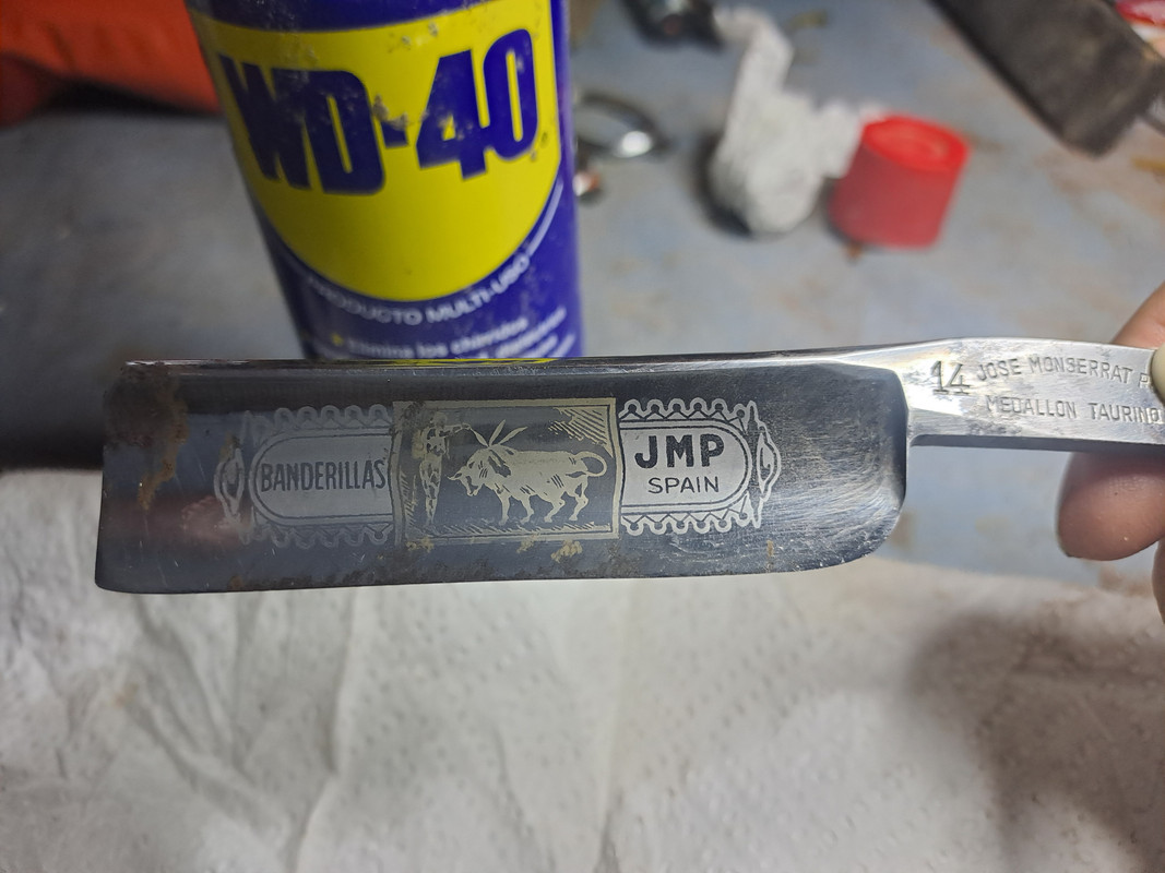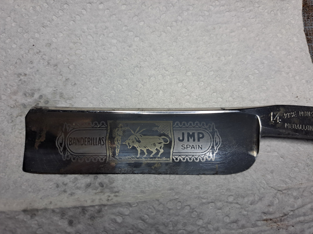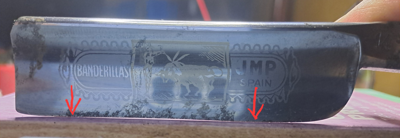 Ha estado muchos años guardada en un cajón, la hoja esta algo gastada, 23,5 en el talón y 22,7 en la punta, tiene un poco de curva por una mala técnica de afilado, pero tiene potencial.