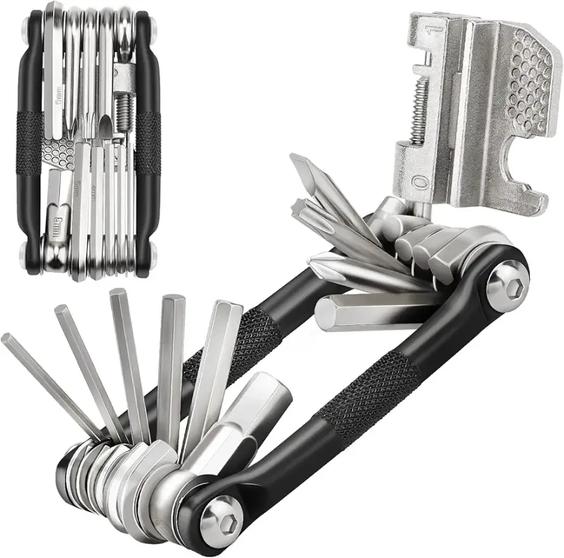 Tengo un kit de herramientas para cambiar la cámara, algo como esto pero más sencillo, sólo puntas de destornillador y palancas para sacar la cubierta, nada de aparatos sofisticados para la cadena o los frenos
