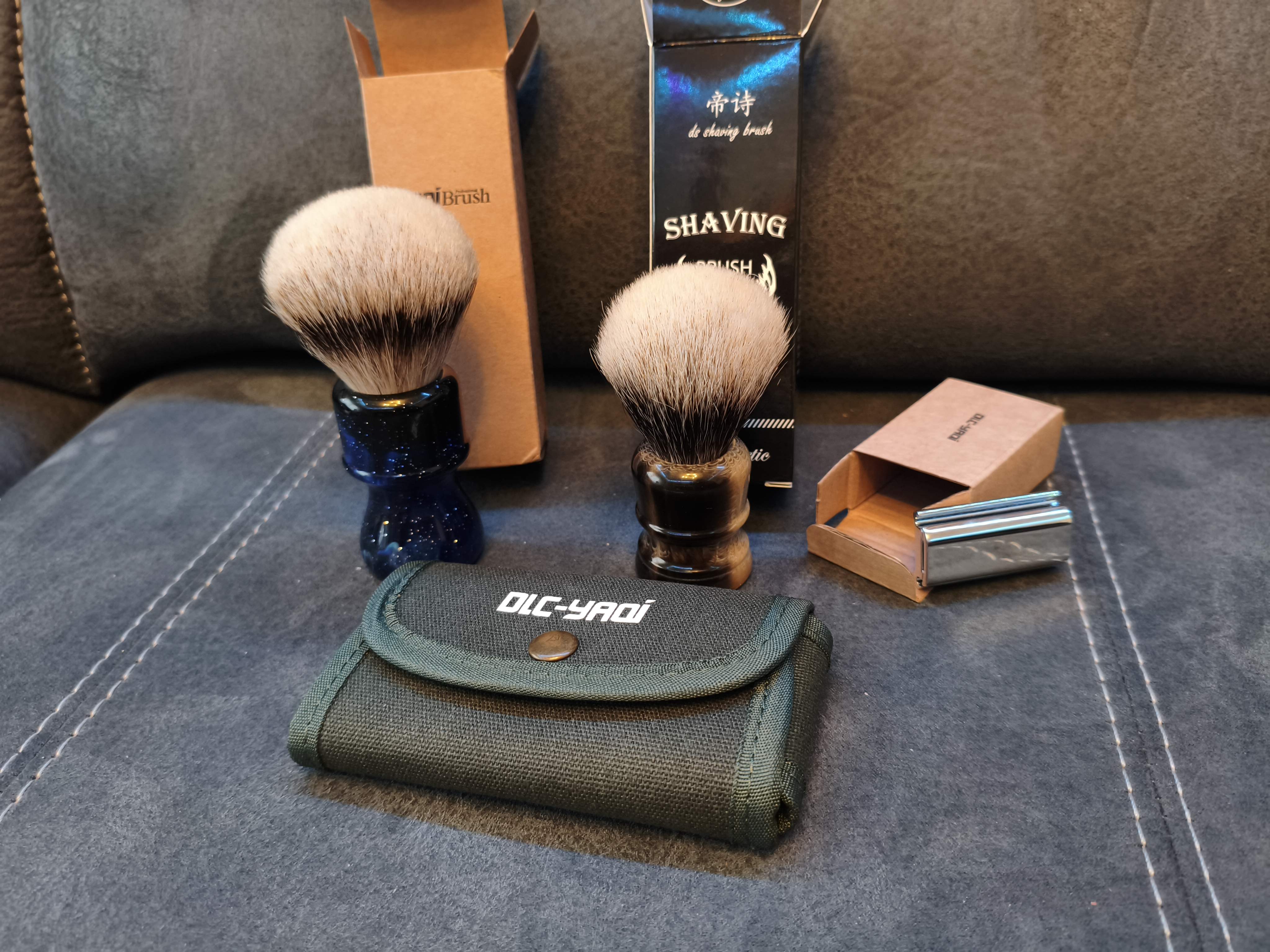Dos tejonas, un cabezal Yaqi y un estuche de viaje para maquinilla y cuchillas.