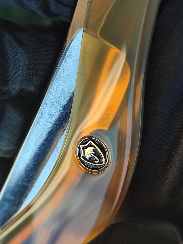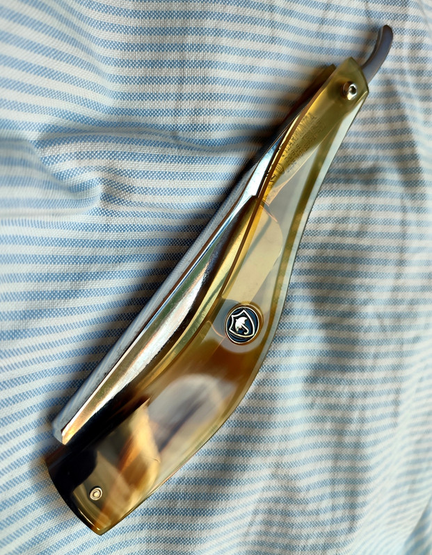 En cuanto al “vestido”… Partimos de un material de sobra conocido y utilizado en cuchillería, una placa de cuerno rubio de búfalo, prácticamente idéntica a esta, con inherente translucidez.