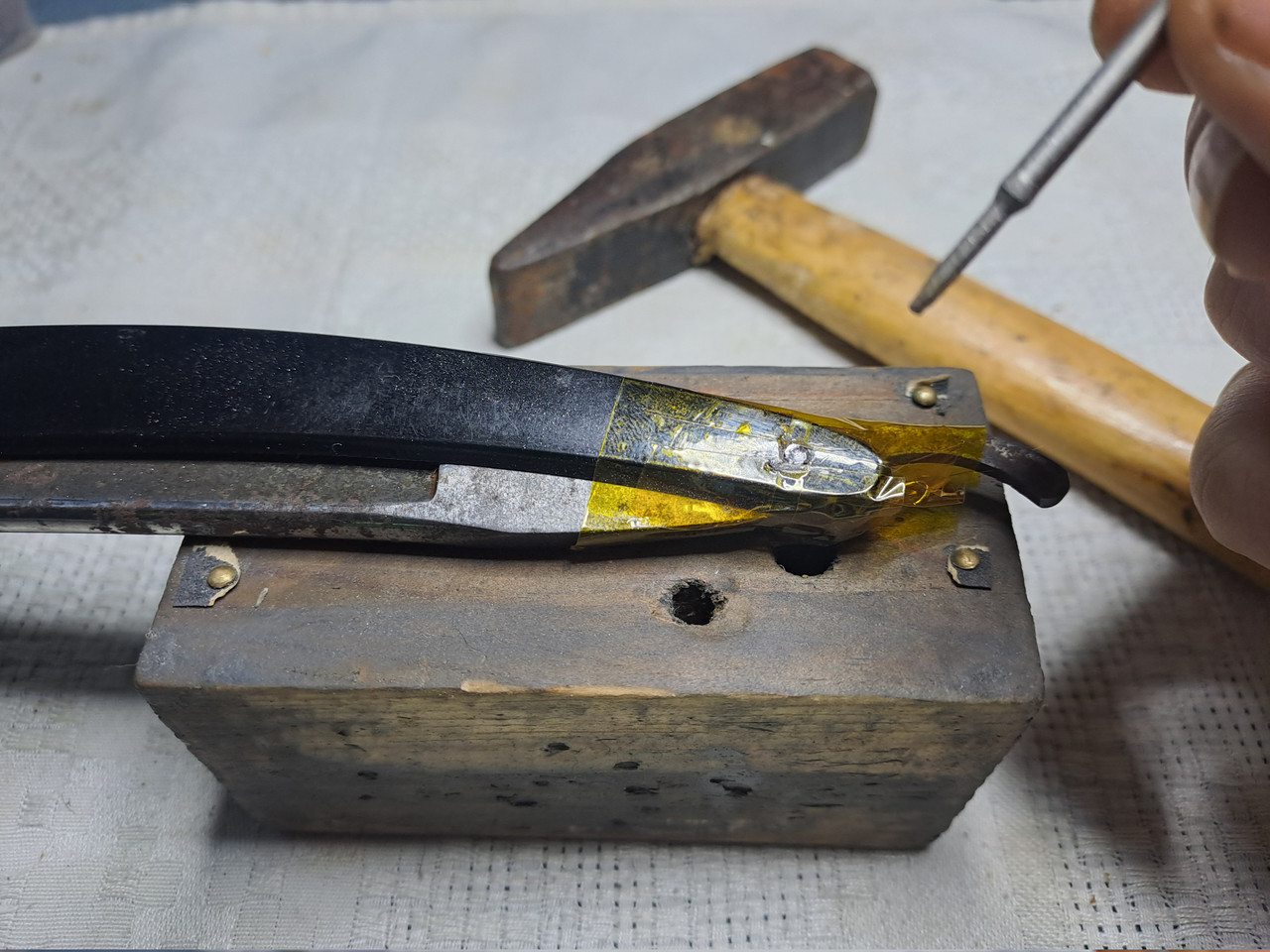 Ahora le toca el turno a las cachas, he decidido ponerle estas, me recuerdan a las llamas…al fuego, creo que le van a sentar bien, eran de una vieja medallón taurino de punta redonda, lamentablemente rota.
