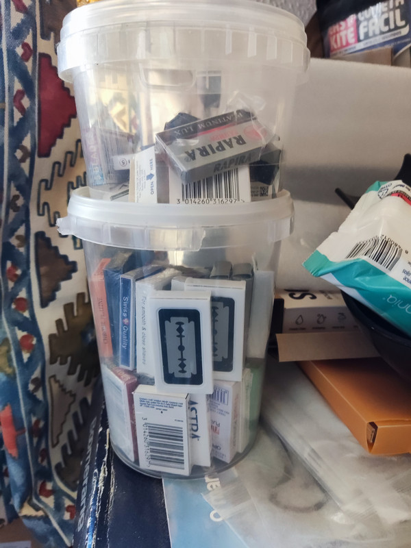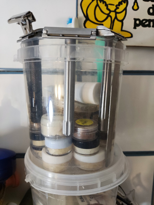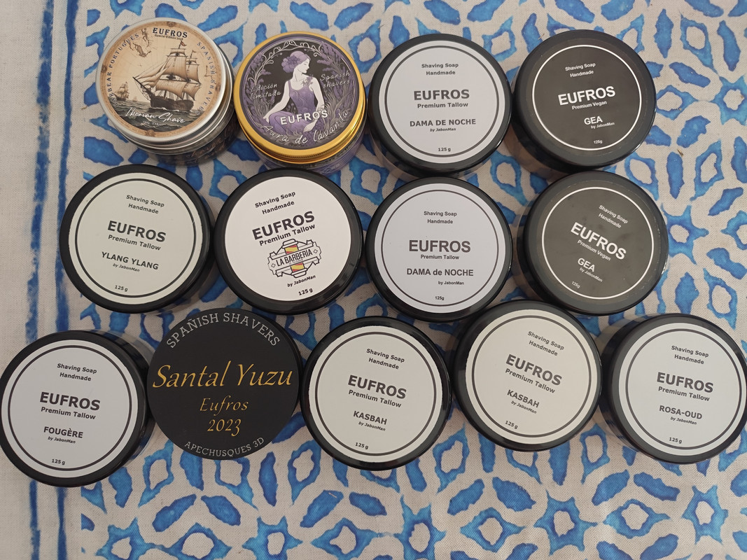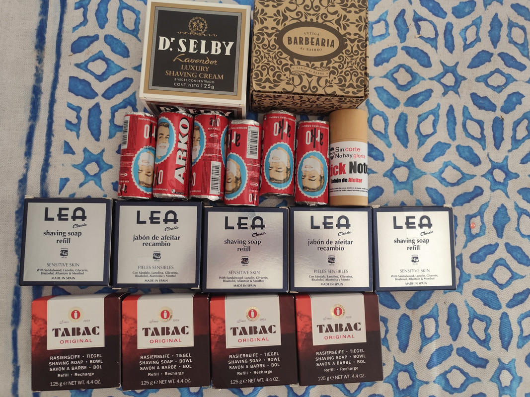 Y por aquí la foto general de familia. He incluido material que no uso habitualmente y tengo guardado en cajones, a espera de que llegue su turno. Entre ello está el jabón Summertime de areffa que adquirí hace unos meses al compañero @Javifran junto con el combo “noir et vanille”. Respecto a este último me ha estado dando unos afeitados gozosos y gourmet en estos meses de frío. El areffa está esperando al calorcito para que llegue su turno.