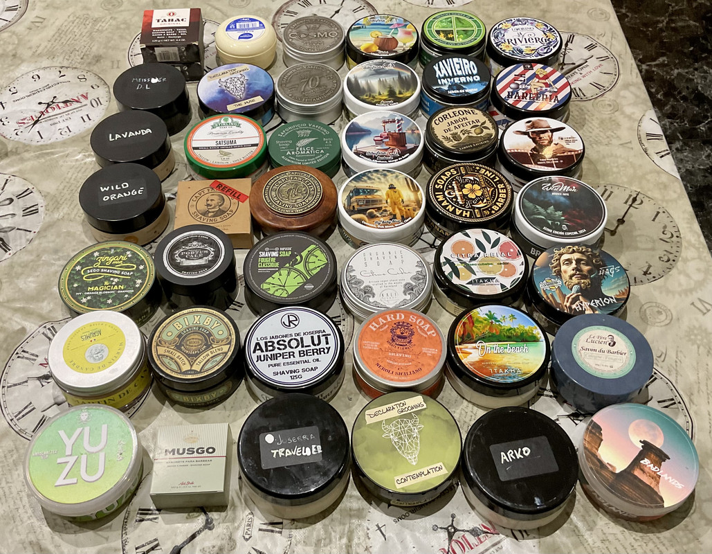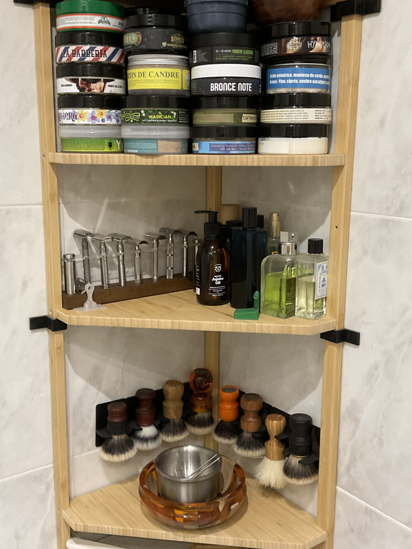 Los afters, algunos recambios, y los sticks de jabones los tengo aparte en un pequeño carrito accesorio. Navajas y asentadores, junto al stock de cuchillas, permanecen a buen recaudo en el armario de mi dormitorio. Todo escondido a plena vista…