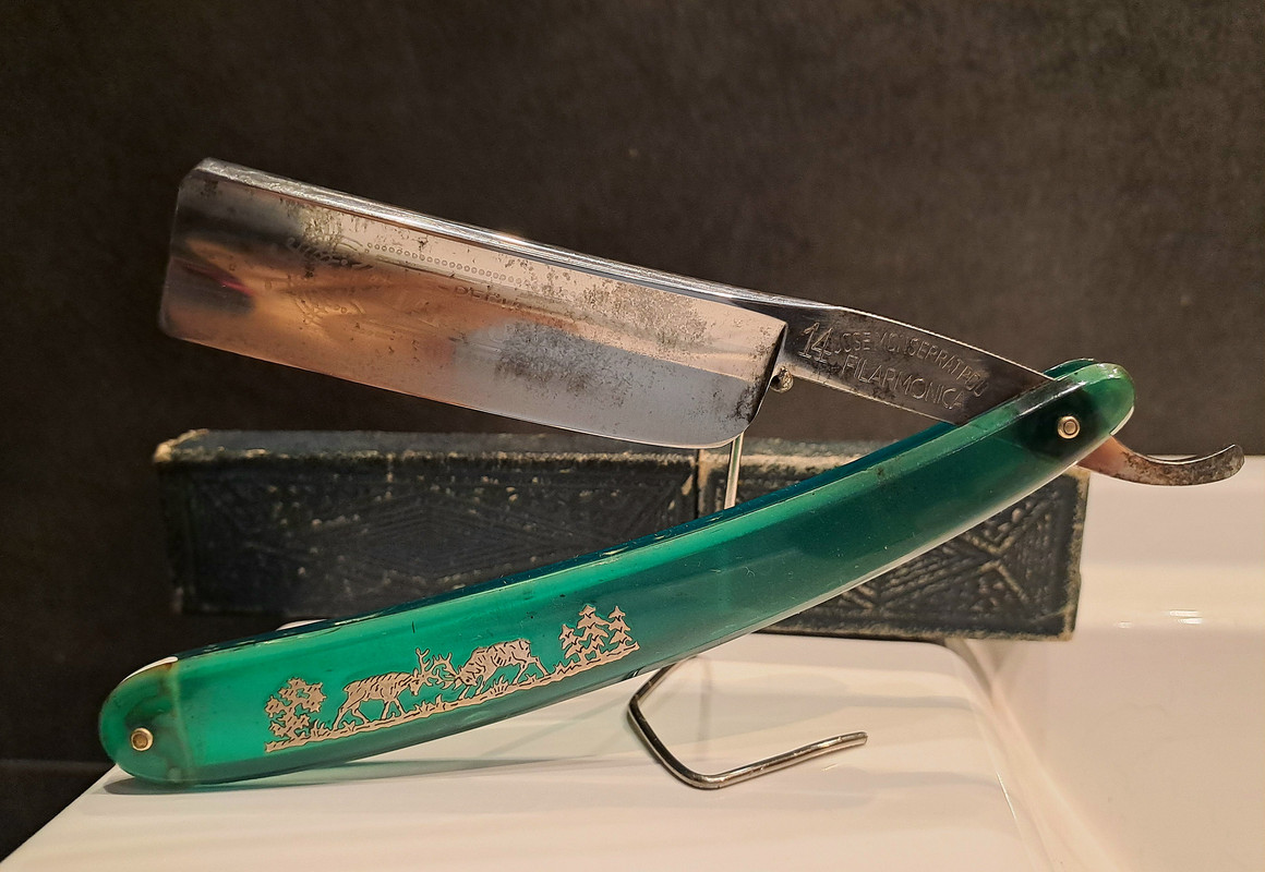 Que espectáculo de colección, yo tengo una especial con cachas de ciervo luchando verde transparente, es de mis preferidas.