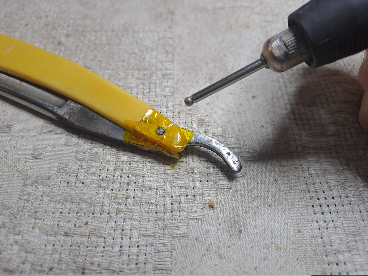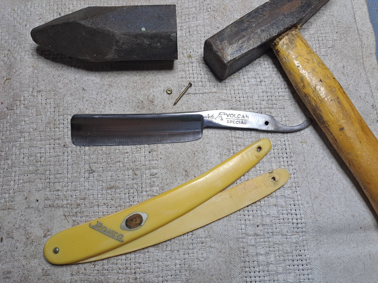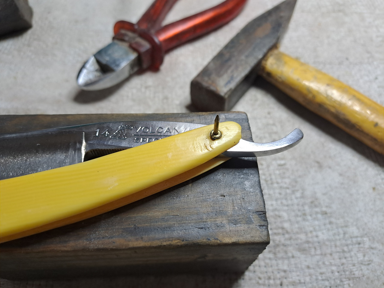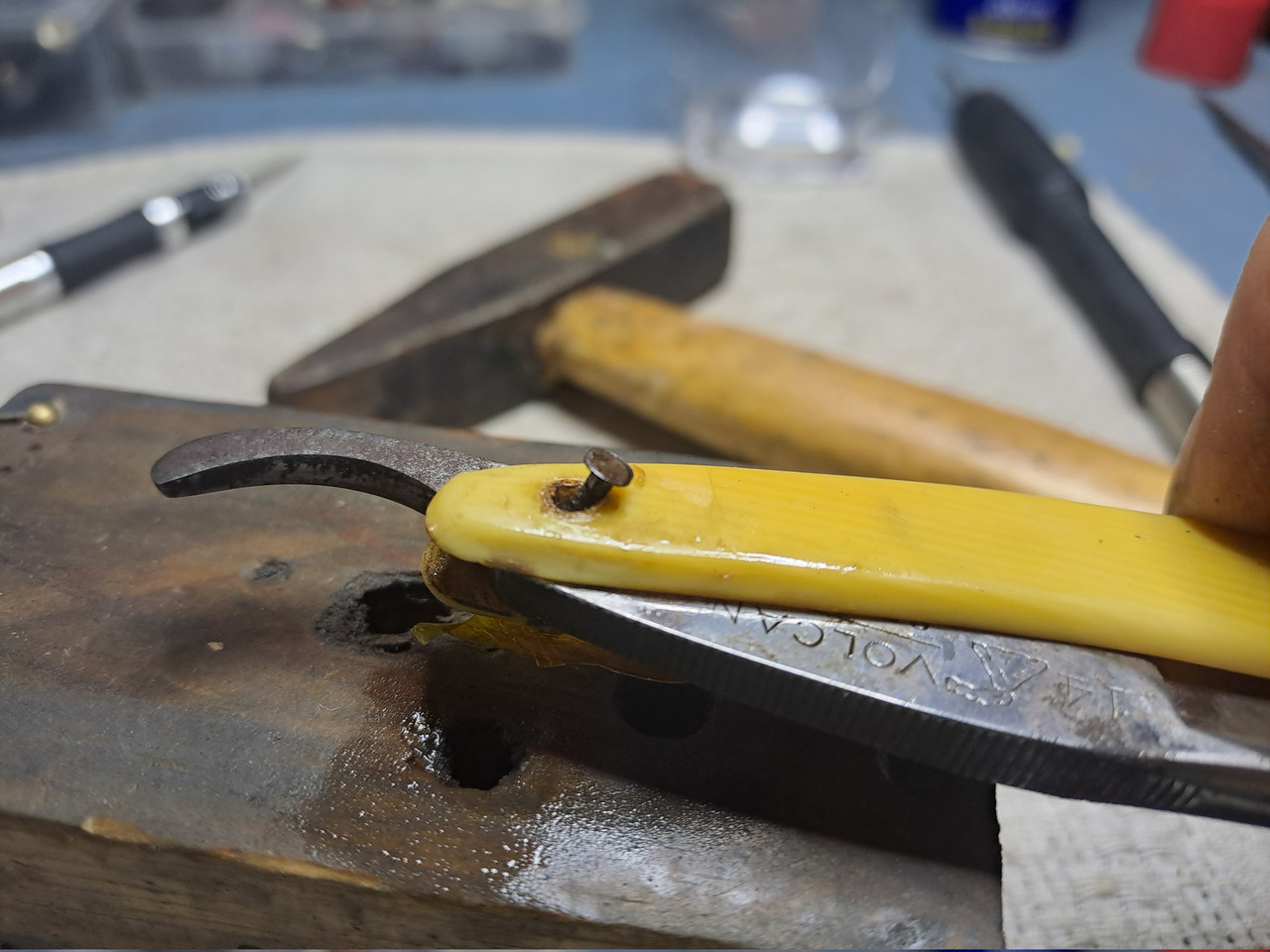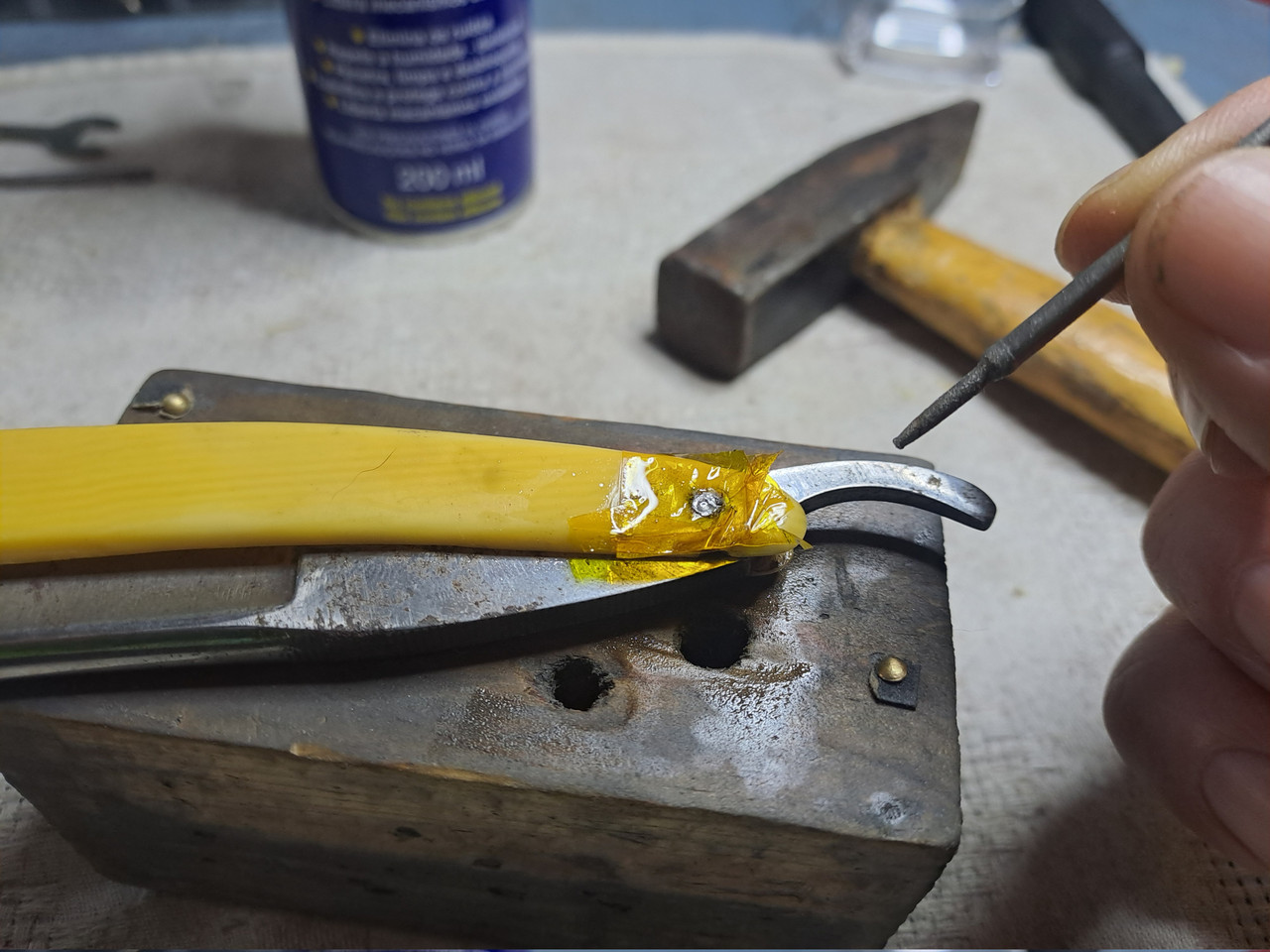 Con todo listo toca montar…aunque ya se que no va a quedar de mi gusto, tiene un agujero demasiado grande…y me faltan arandelas nuevas, esas pequeñas son tremendamente dificiles de encontrar, las voy reciclando de otras navajas y suelen estar abolladas,
