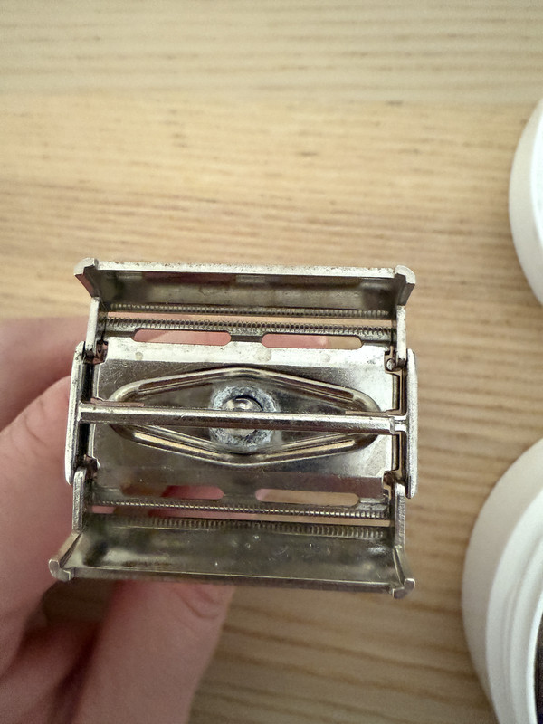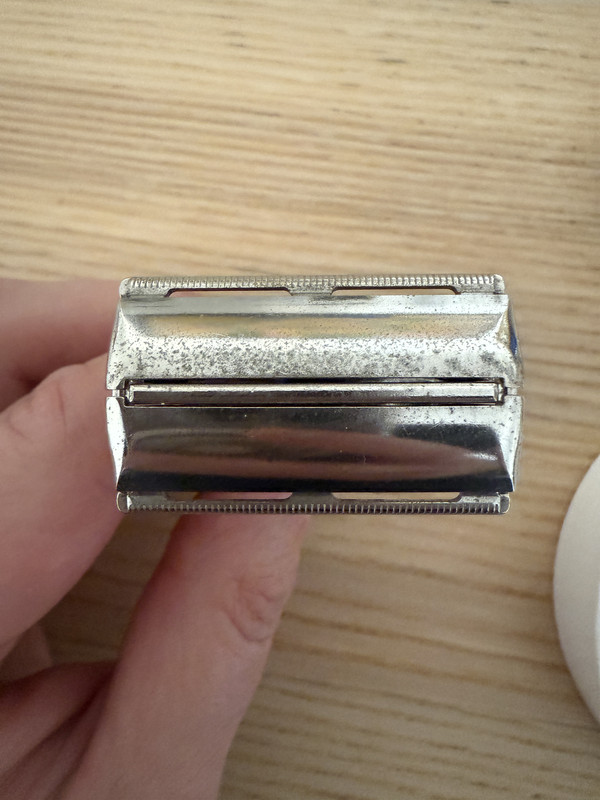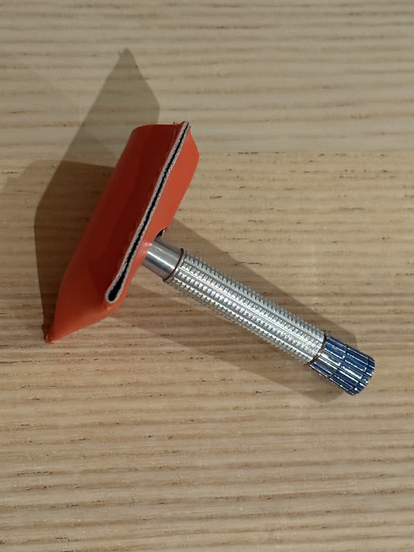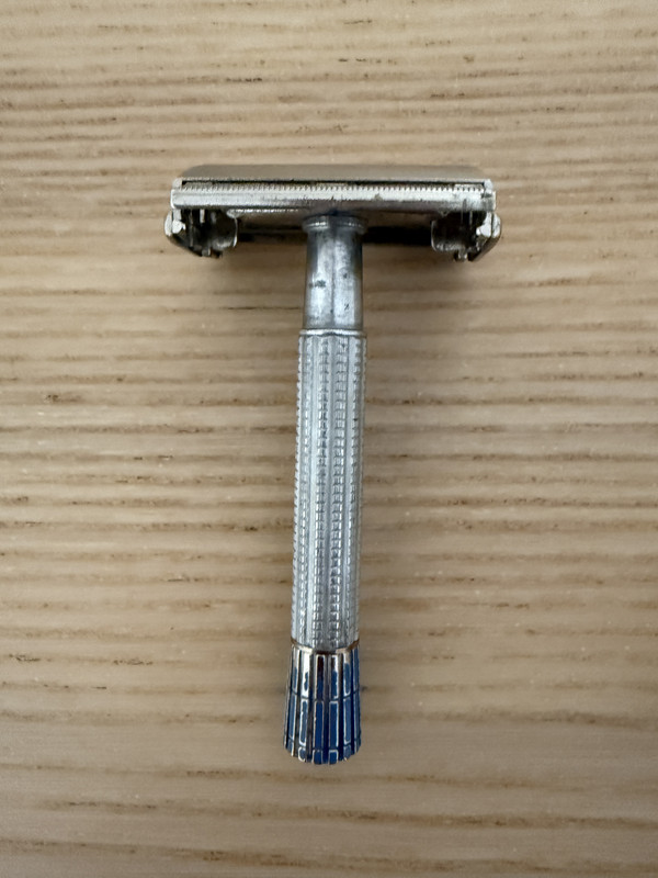 • Gillette Blue Tip E1 (1959) Desinfectada y lista para usar. Es la versión más suave de las Super Speed de los años 50. Muy permisiva y poco exigente con la técnica. Ideal para afeitado diario. No esta pulida. No recuerdo haber visto alguna por aquí en los Afeitados del Día.