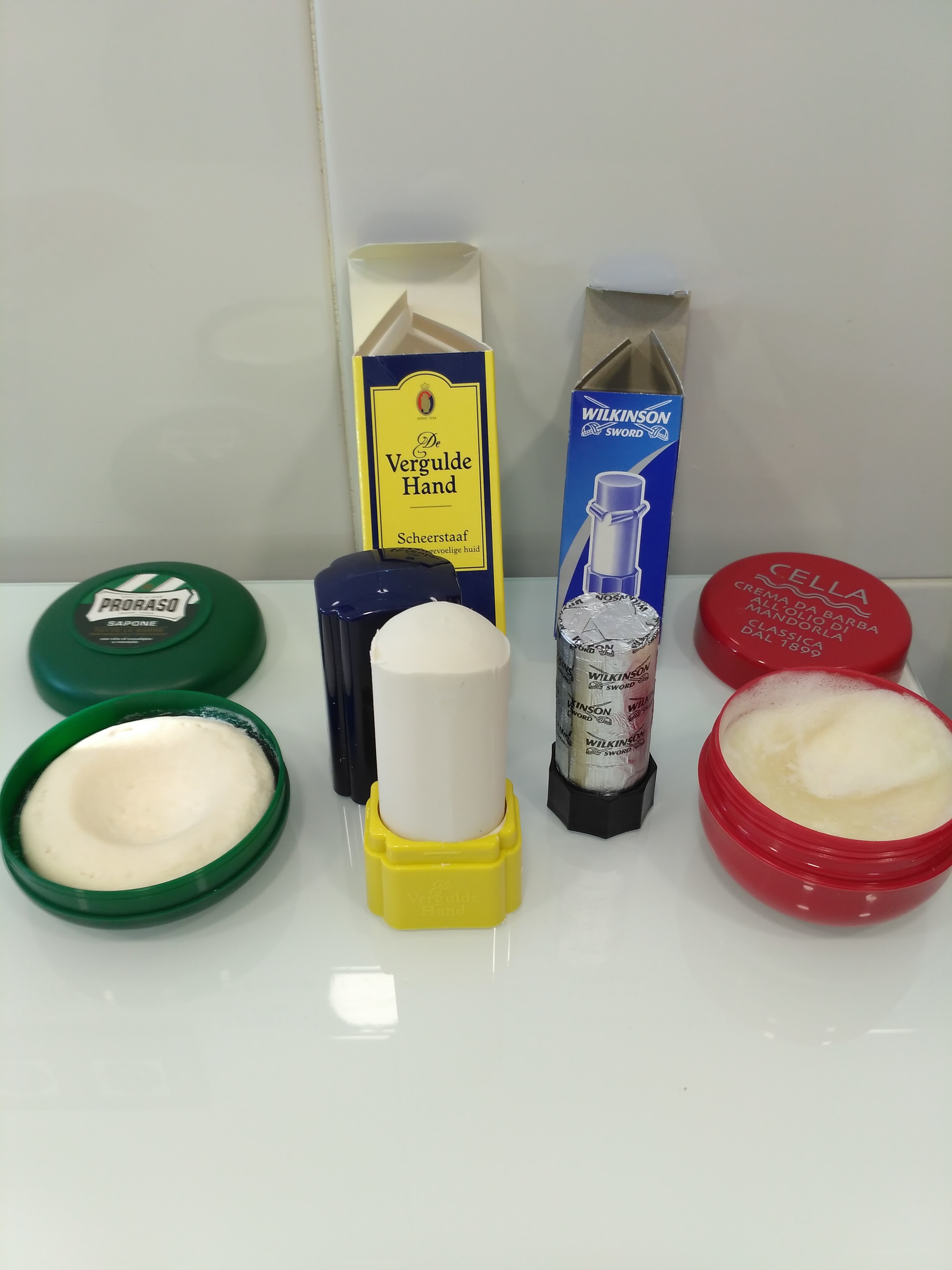 Lote 3: Jabón Cella (80%) + Jabón Proraso Eucalipto & Mentol (85%) + Stick Wilkinson (A estrenar) + Stick Verdulge Hand (A estrenar) VENDIDO