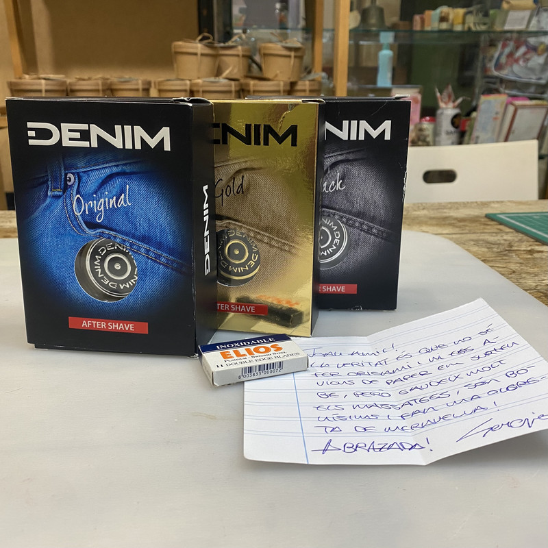 Hace tiempo que empecé a ver esta marca de afters, pero lamentablemente por mi zona ni cerca ni lejos, se comercializa. Al saberlo, @Lampardi me hizo llegar estos 3 frascos de Denim, Original, Black y Gold. Y unas cuchillas surtidas, no sea que no tenga con qué afeitarme. Mil millones de gracias Sergio pero sobre todo por la nota manuscrita. Eso, hoy día, vale más que todo lo otro.