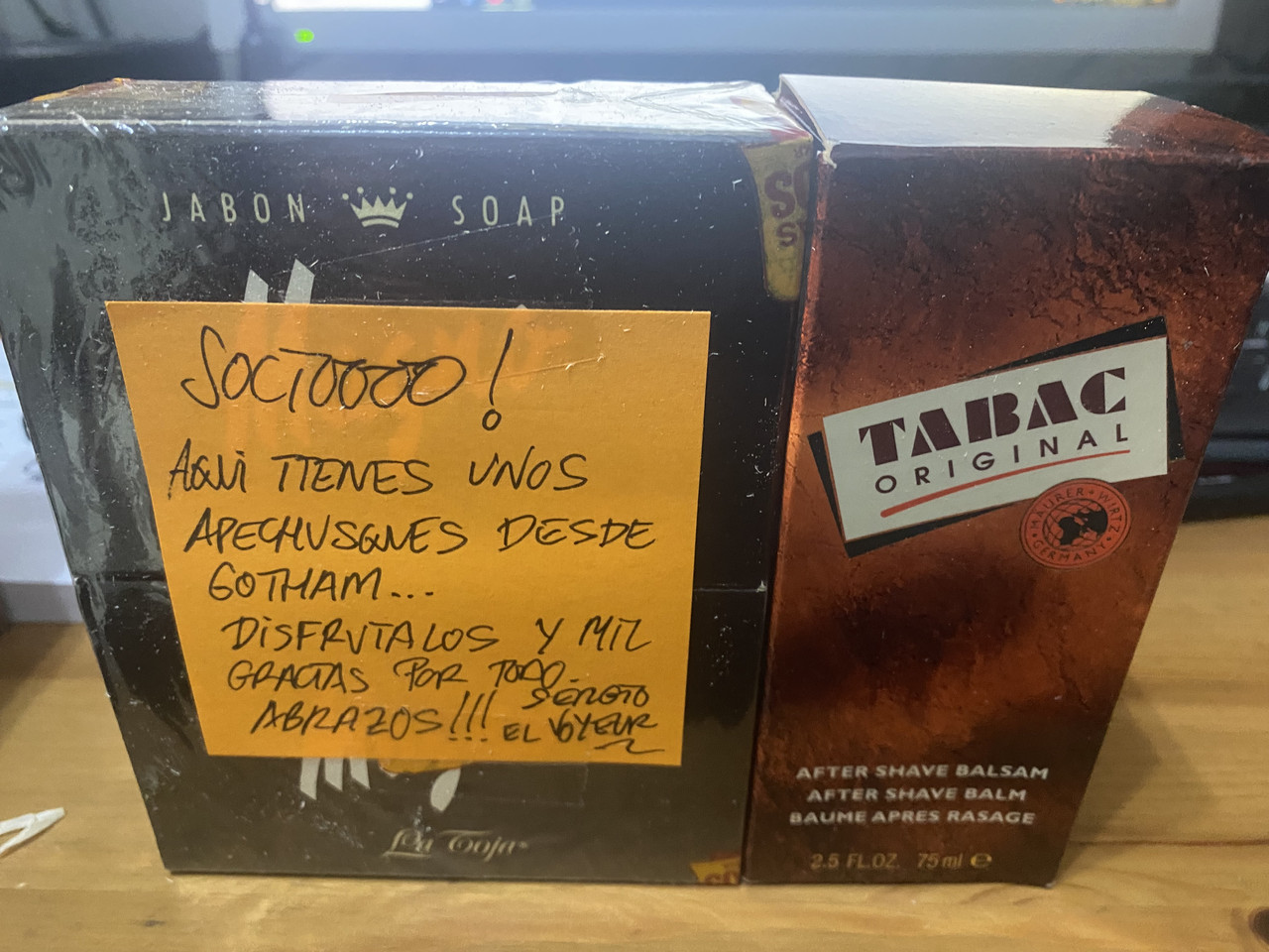 Esa letra no tiene la floritura habitual. Lo ha escrito de pie y con el post it sobre las pastillas de jabón. ![]()