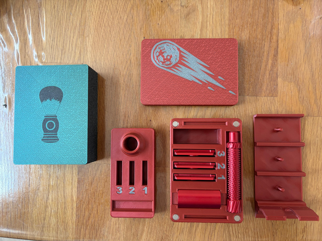 Quien conoce el de la rockwell 6s ya sabe de que va el tema, huecos a medida para cada elemento y un hueco para poder llevar un par de cajetillas de cuchillas, hay cajas cuchillas de distintos tamaños pero a las malas, sueltas en su papel, entran 10 minimo, hay unos huecos que encajan con la tapa y evitan desplazamientos horizontales, y los imanes impiden que se abra verticalmente.