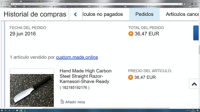 Creo que al aceptar la mejor oferta tal cual la hice, me vincula y obliga a comprar, pero he escrito al vendedor diciéndole que quiero retirar la oferta porque tengo serias dudas de que eso sea acero de damasco. A ver qué dice… Si es un poco listo, aceptará mi renuncia, porque si me obliga a comprarla y luego veo que el dibujo se va frotando, le cancelo el pago por paypal y me quedo tan a gusto.