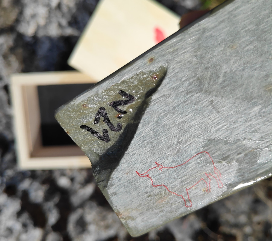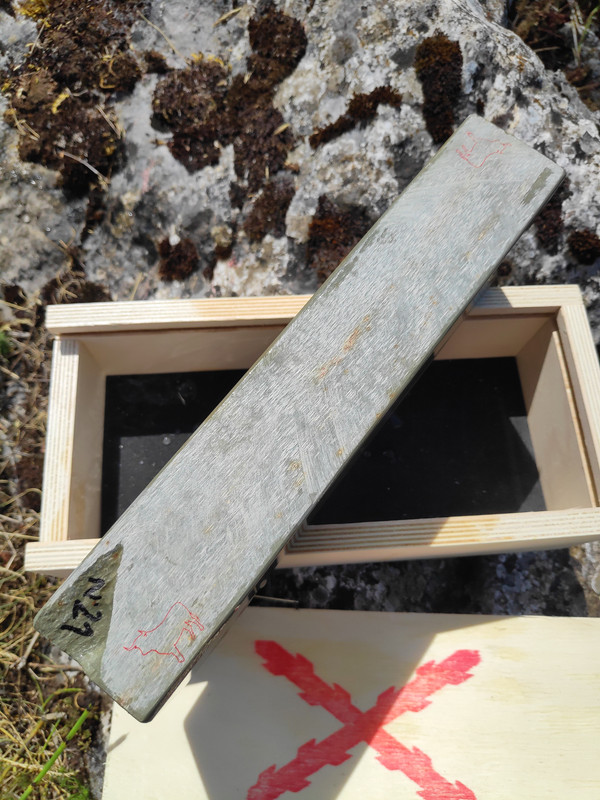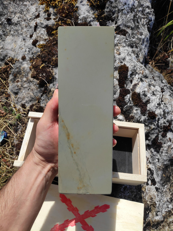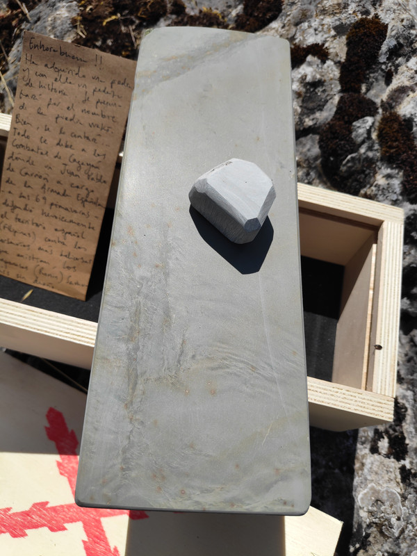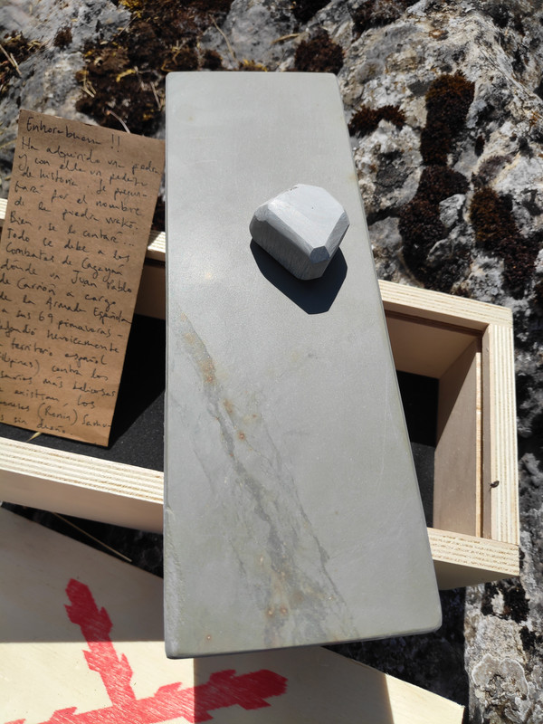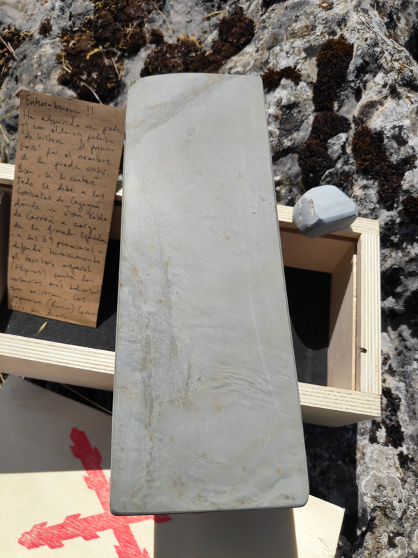 Only the marbled ones bear the Toro seal on the edges of the stones. You’ll see some slurry stones with this seal; they aren’t marbled, but rather tests I made with the seal. The box also features another different pyro-engraving, in honor of its discoverer, Juan Carlos Vergel.