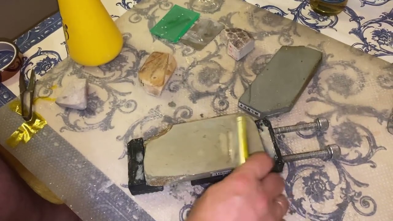 Ayer hice un afilado completo de esta bonita Böker Schildpatt 6/8" versión 1.0 (punta redonda) con cachas de concha de tortuga falsa. Sacando bisel en las Naniwas Pro 1k y 5k, luego pasé a las jnats - como siempre últimamente: Aiiwatani Awesado de base con el barillo de las naguras básicas (progresión corta) - Botan, Mejiro, Koma y final en la piedra de base debajo de chorrito de agua en el fregadero. Mucho cuero para terminar. Vista del filo tras el barrillo de Koma es la siguiente: