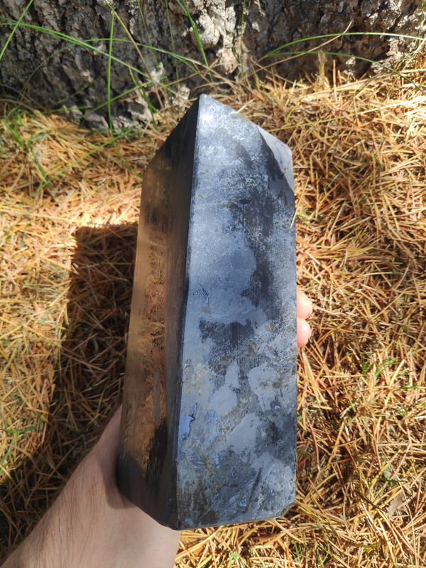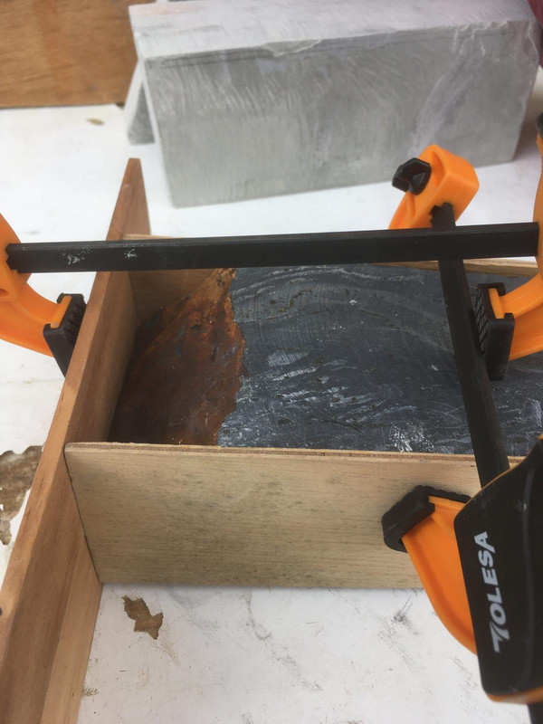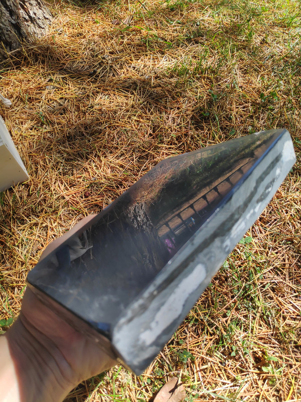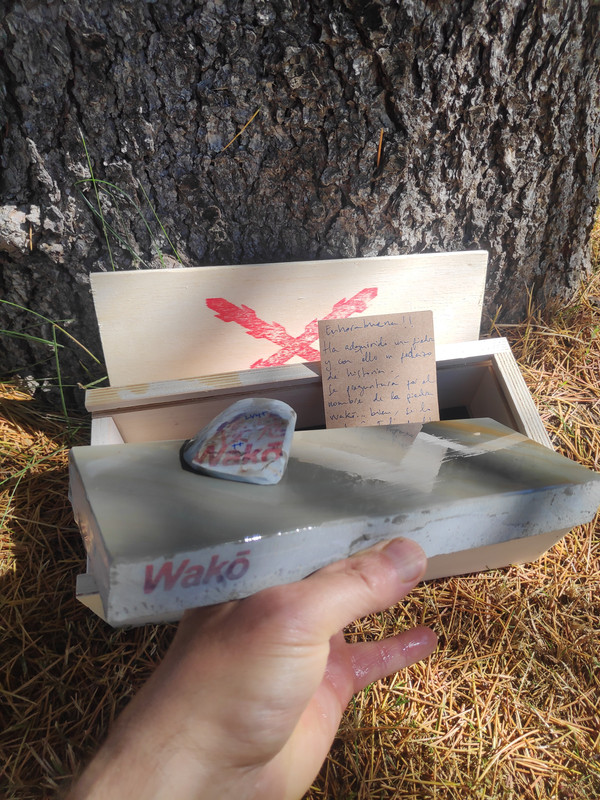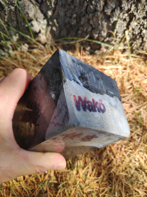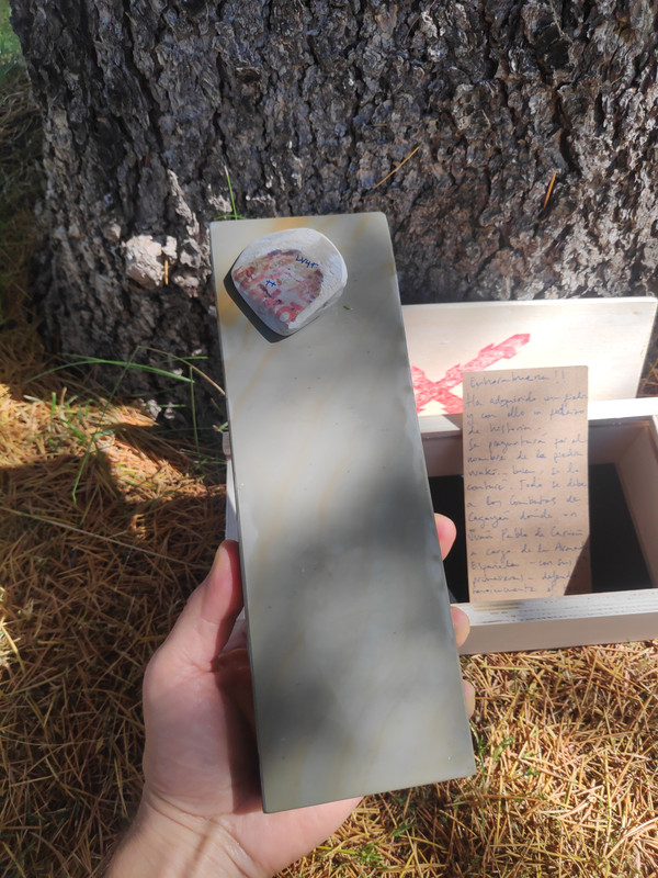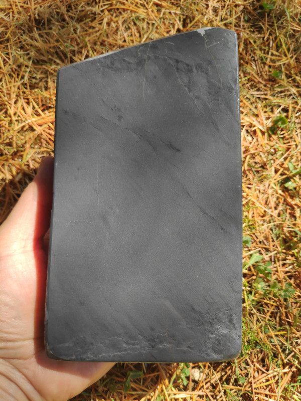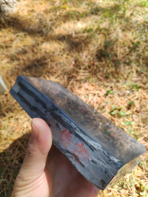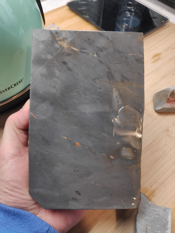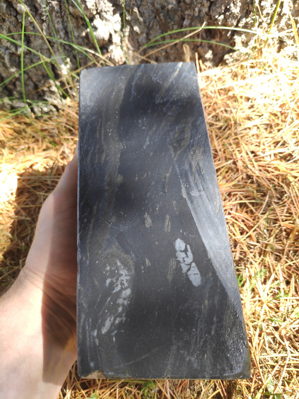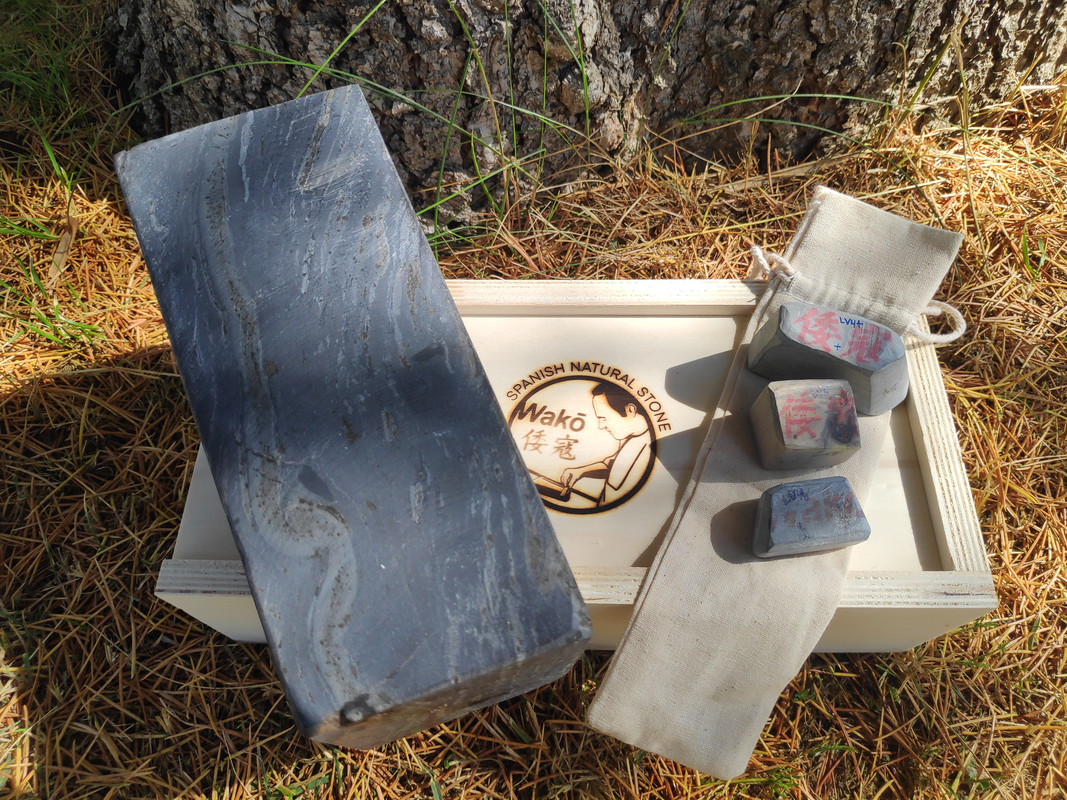 Quiero desarrollar con él una piedra especial para cuchillos de grit medio y si sonara la flauta, dos; hay otra piedra de la que no os he hablado nunca, que a mi me encanta pero no sirve para barberas. Desconozco completamente que tan buena sea para cuchillos ya que todo lo que tenga que ver con el afilado, aunque me gusta, pues no tengo el suficiente criterio y necesito siempre que manos expertas me guíen. Y ya que estoy, os hablaré de este otro unicornio. Es una pizarra con vetas blancas dentro de su negra oscuridad (pleonasmo), con poca y muy esparcida cuarcita pero con incrustaciones de pirita muy grandes. Esto es lo que impide que sea buena para barbera ya que esa pirita debe dejar rayas en el bisel. El caso es que huele a fósforo que tira para atrás, es una maravilla lapearla y oler su aroma, si lo haces bajo el agua la piedra deja suspendido formaciones de otros minerales que se pueden coger con la mano y luego devolver al agua. Es Lv6 seguro, una bestialidad de dureza para ser una pizarra. Tiene porosidad nula, mucho menos que cualquier wakō -al loro con esto- y sobre el grit prefiero a esperar a que Cristóbal se pronuncie. A esta le hice un enconfrado para mejorar el asiento . …