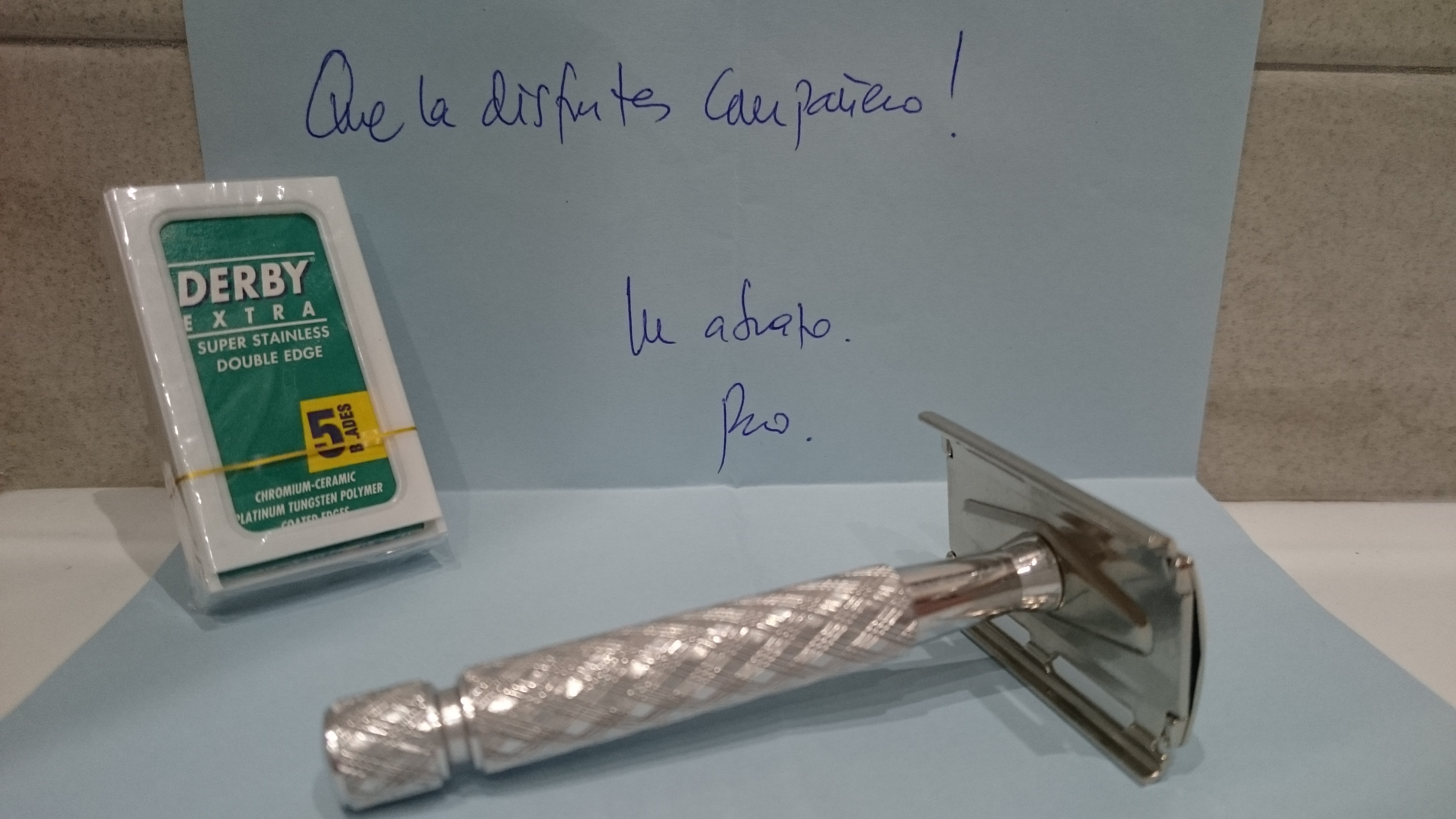 Maquinilla y cuchillas de regaliz recibidos sin contratiempos, la verdad es que aunque no llevo mucho recorrido en los foros, si que he comprado bastante, sobretodo relojes y jamás nadie había tenido el detalle de enviar una nota manuscrita.