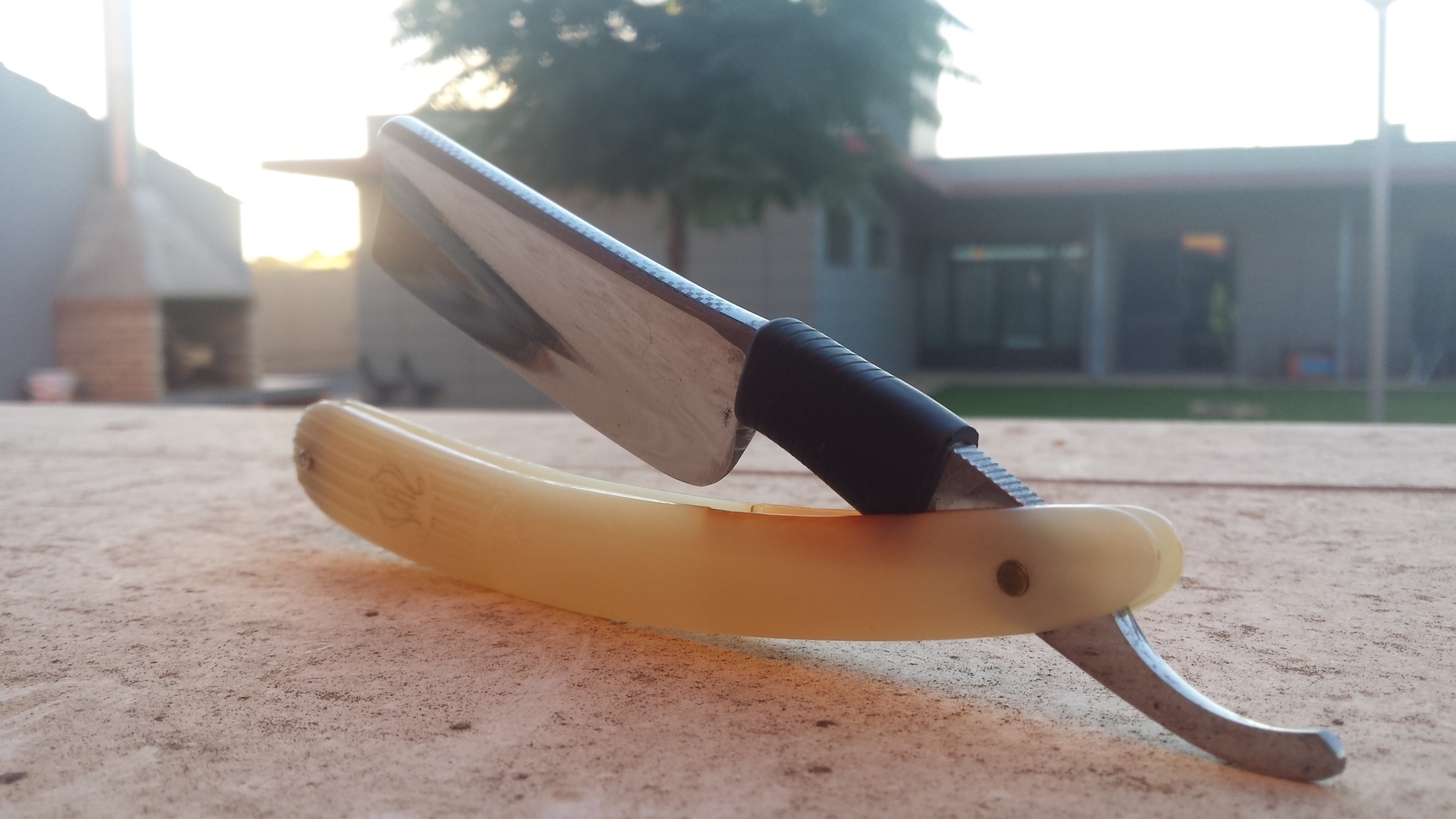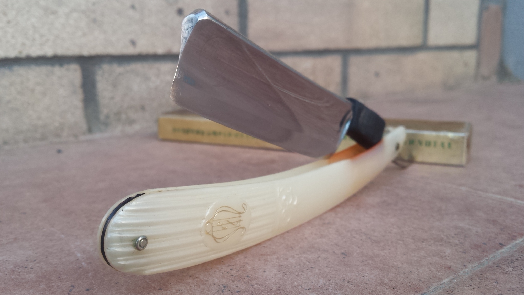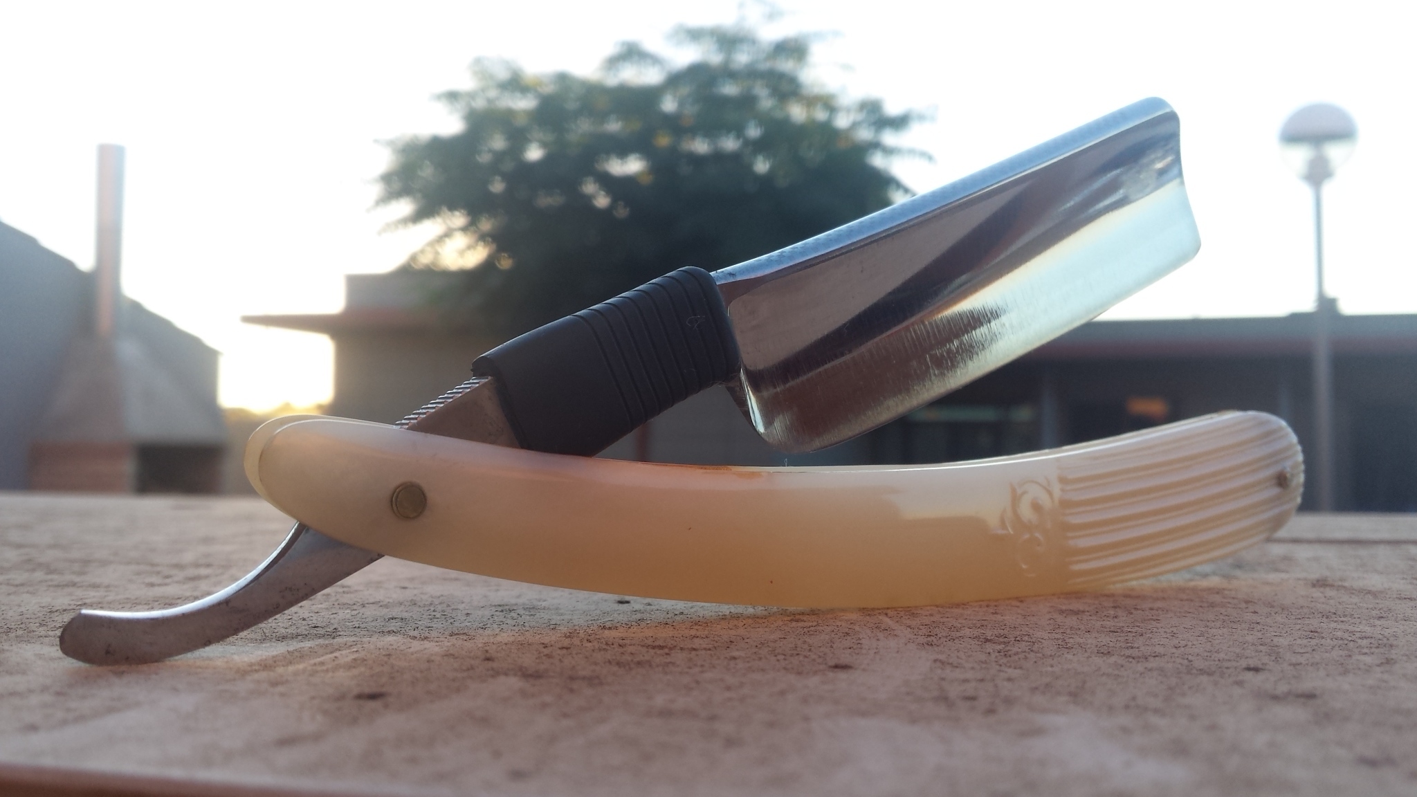Tiene aproximadamente medio centímetro del último tramo de la hoja de un vaciado extremo de quién la reafiló en su día y tiene un filo cojonudo que pierde con relativa rapidez al menos en mi barba ultra dura, dada su delgadez.