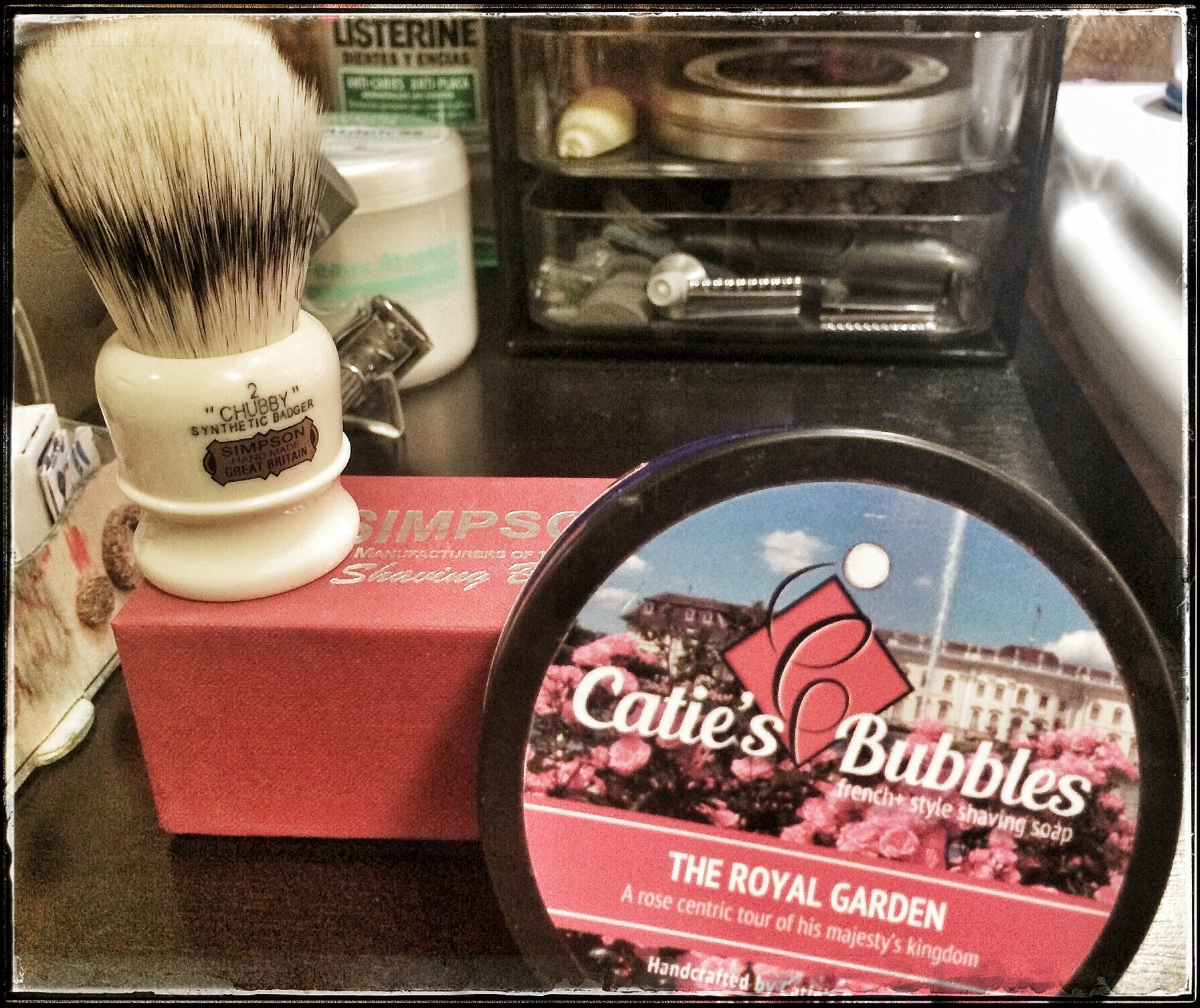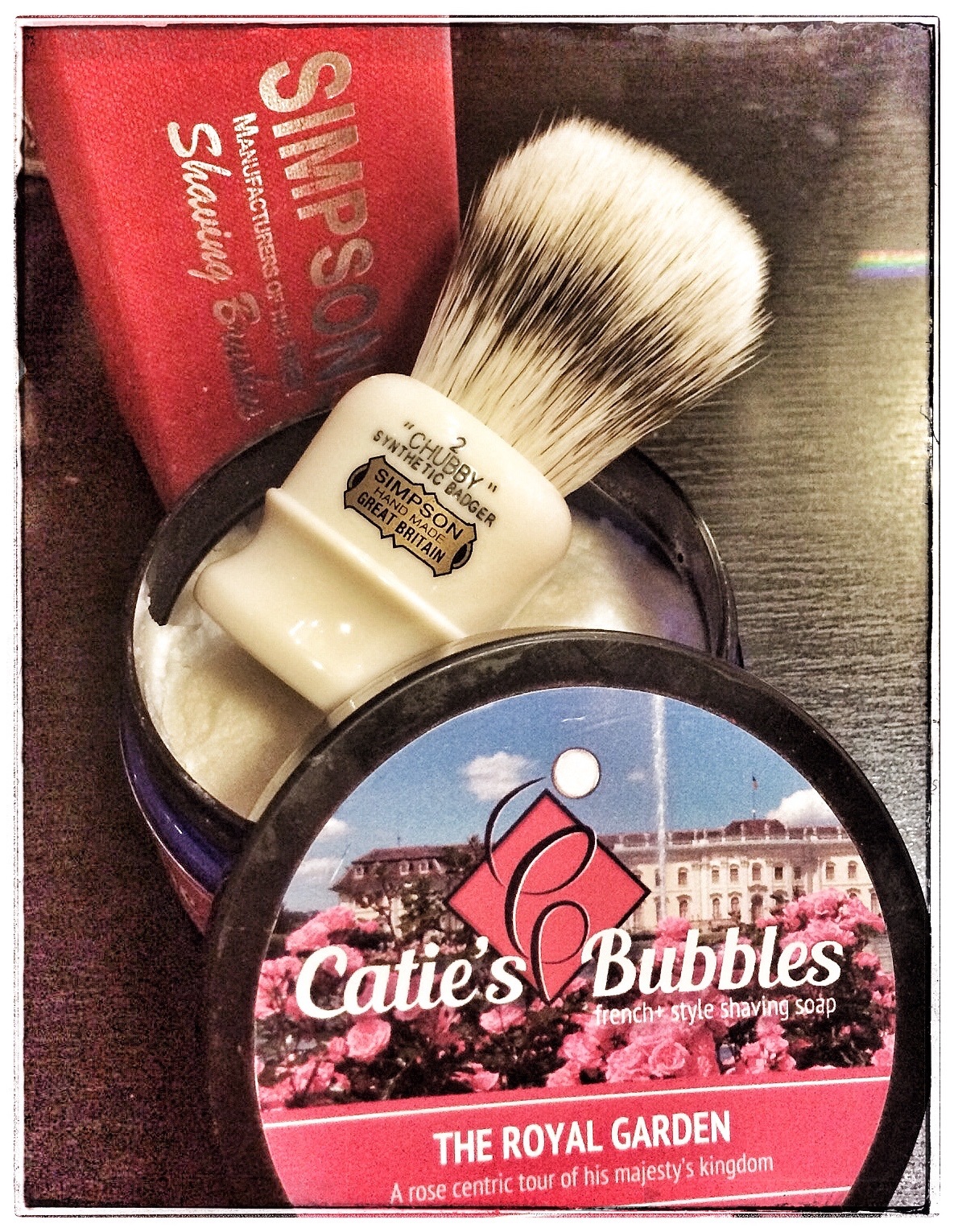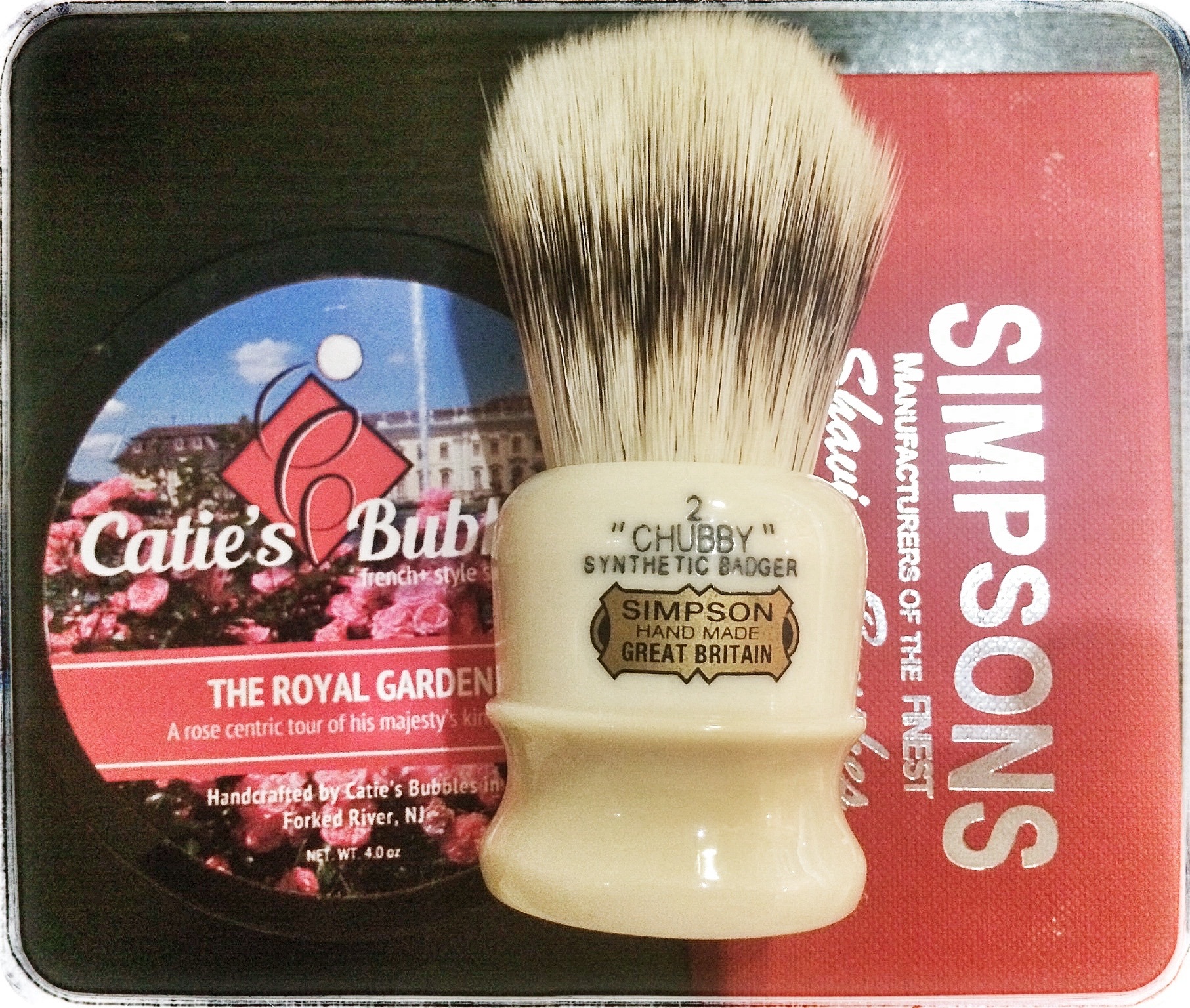 Vendo una brocha Simpson “Chubby 2” de pelo teón sintético, muy suave y lo suficientemente rigida para cargar jabones de todo tipo. La brocha está nueva, tendrá unos cinco-seis usos. Se vende con un gran jabón, el Catie’s Bubble “The Royal Garden” de formulación French+