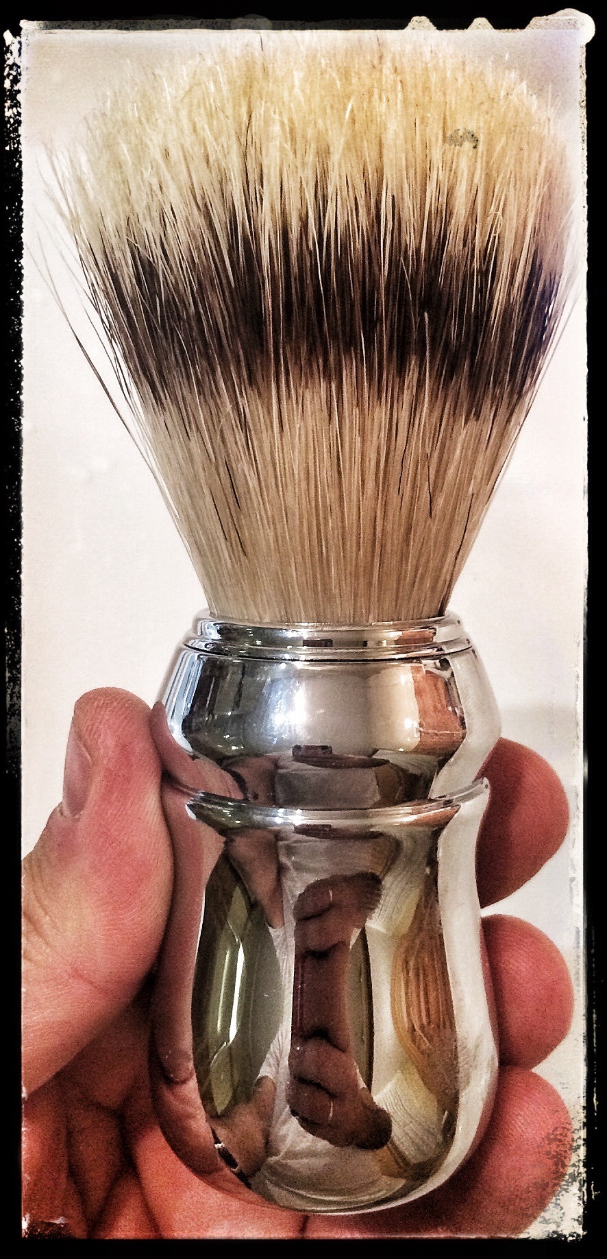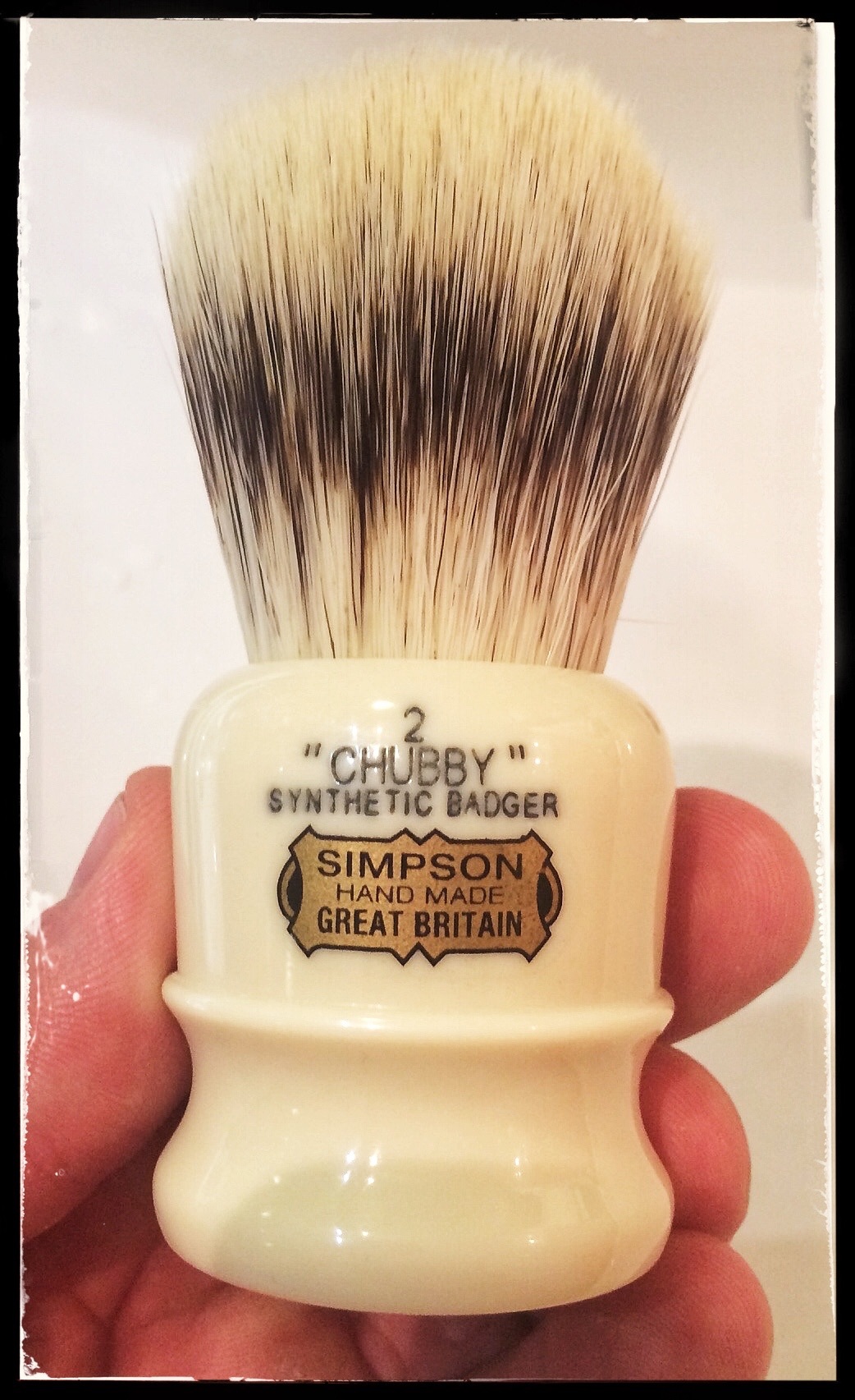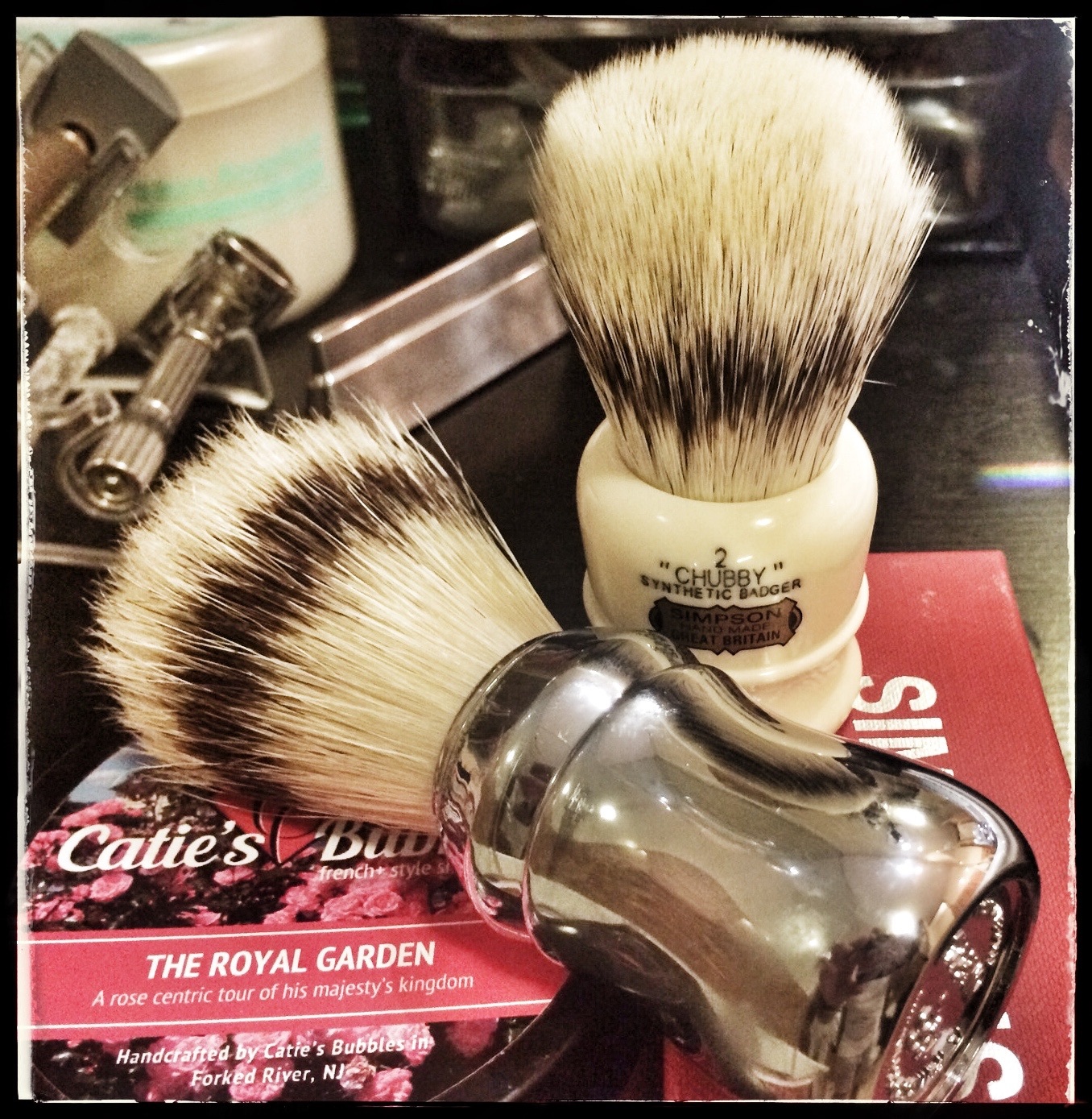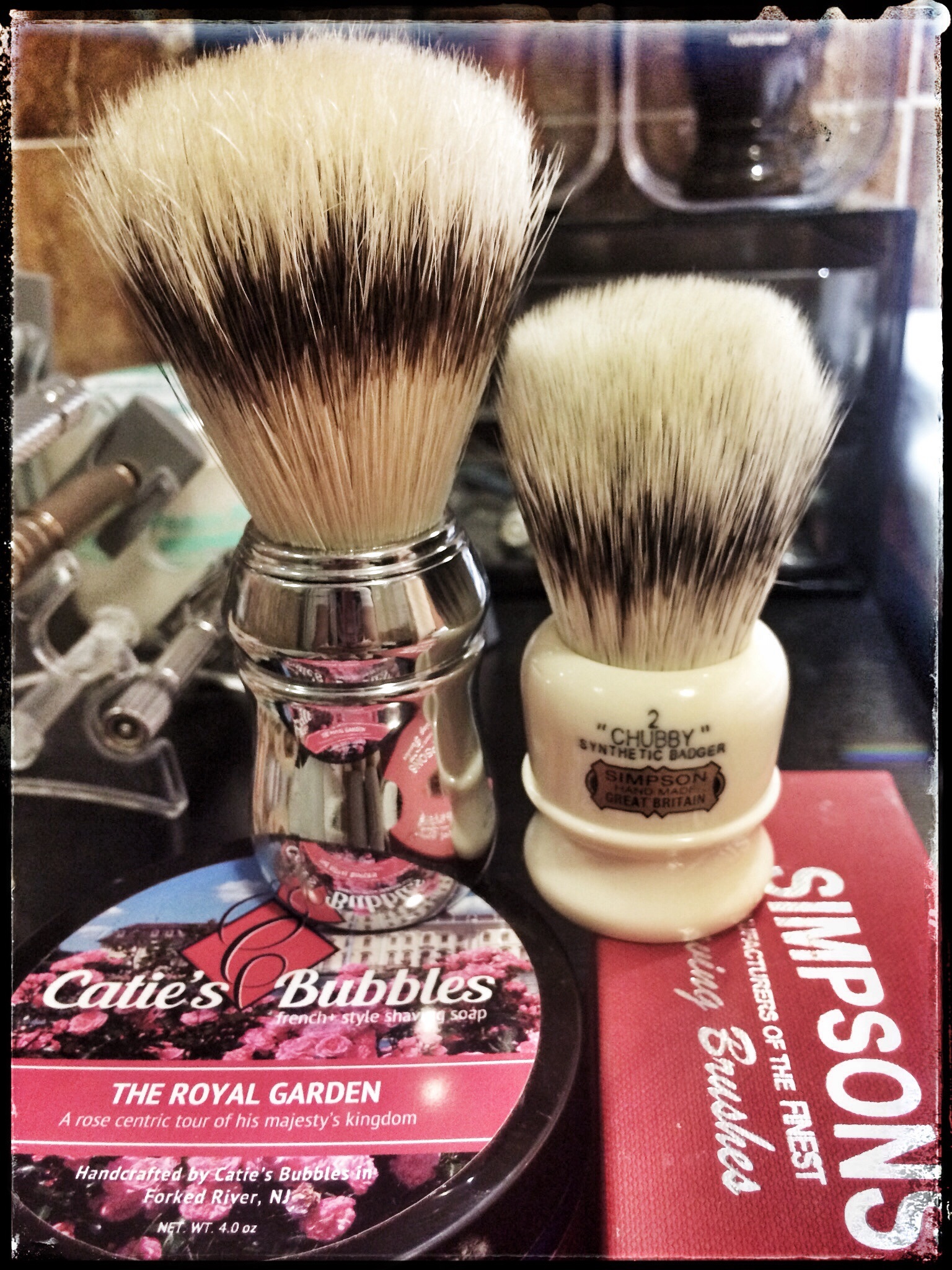Vendo una brocha Simpson “Chubby 2” de pelo teón sintético, muy suave y lo suficientemente rigida para cargar jabones de todo tipo. La brocha está nueva, tendrá unos cinco-seis usos. Se vende con un gran jabón, el Catie’s Bubble “The Royal Garden” de formulación French+