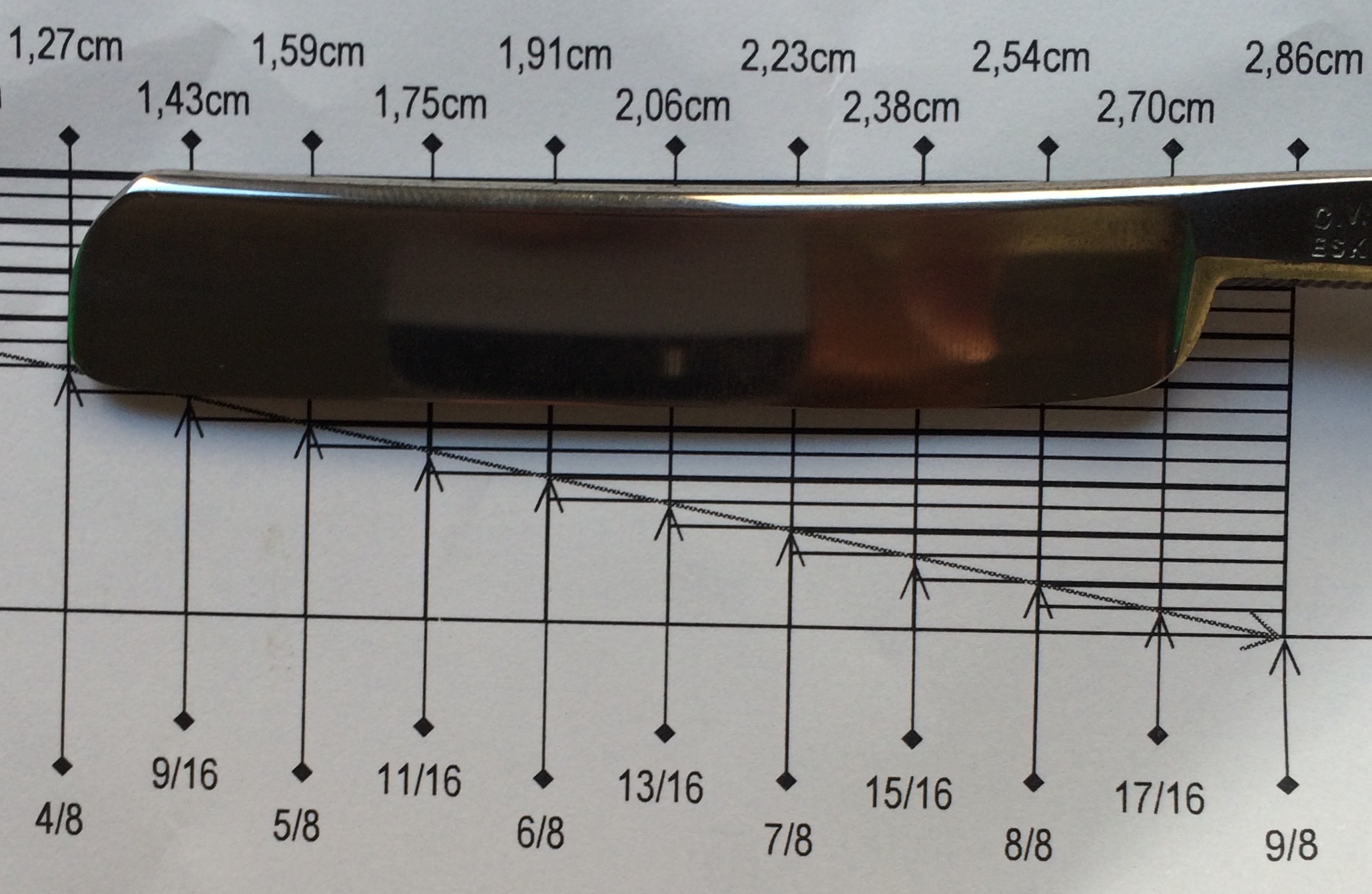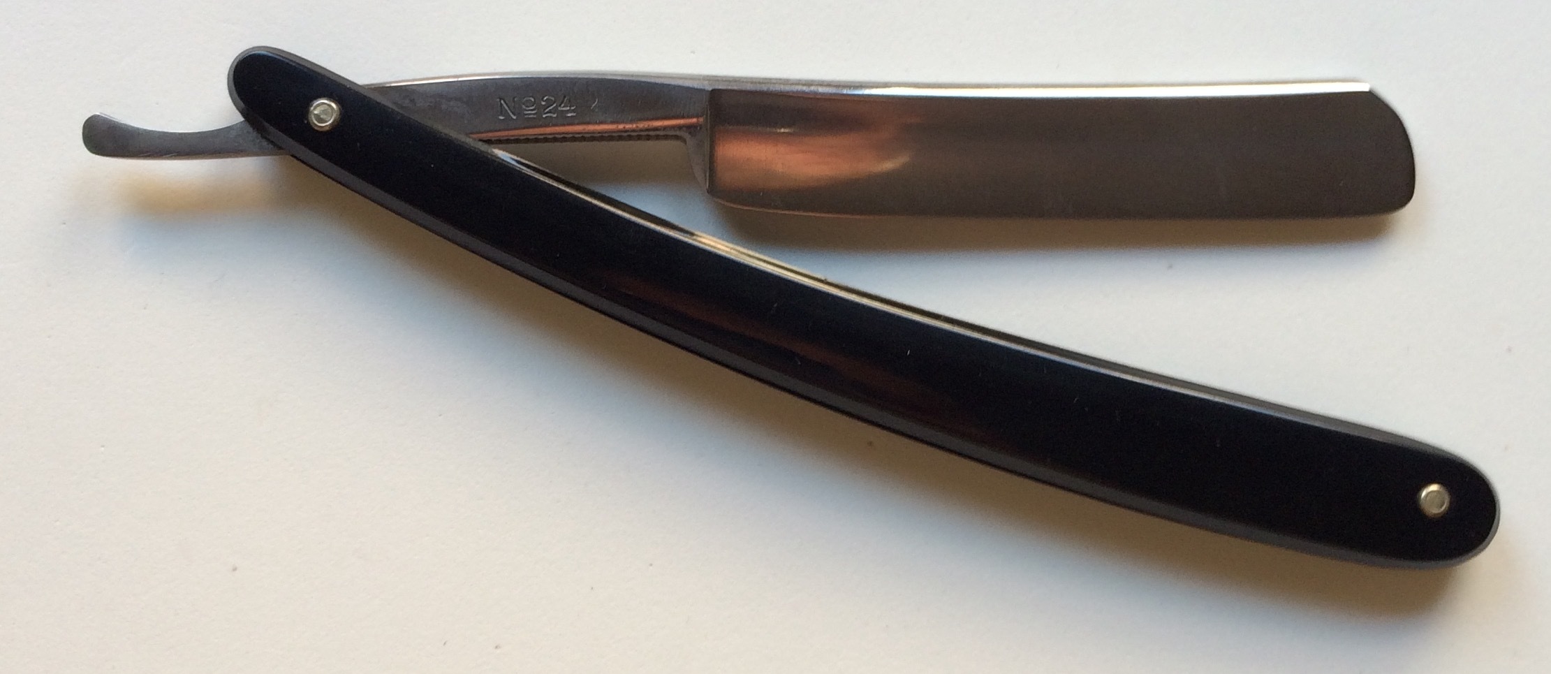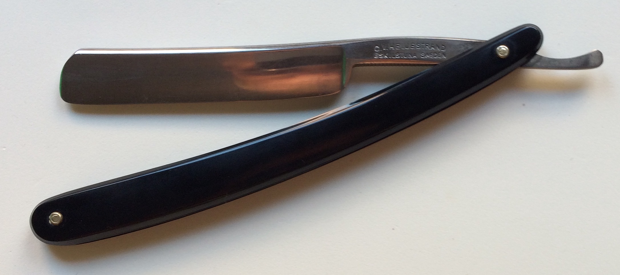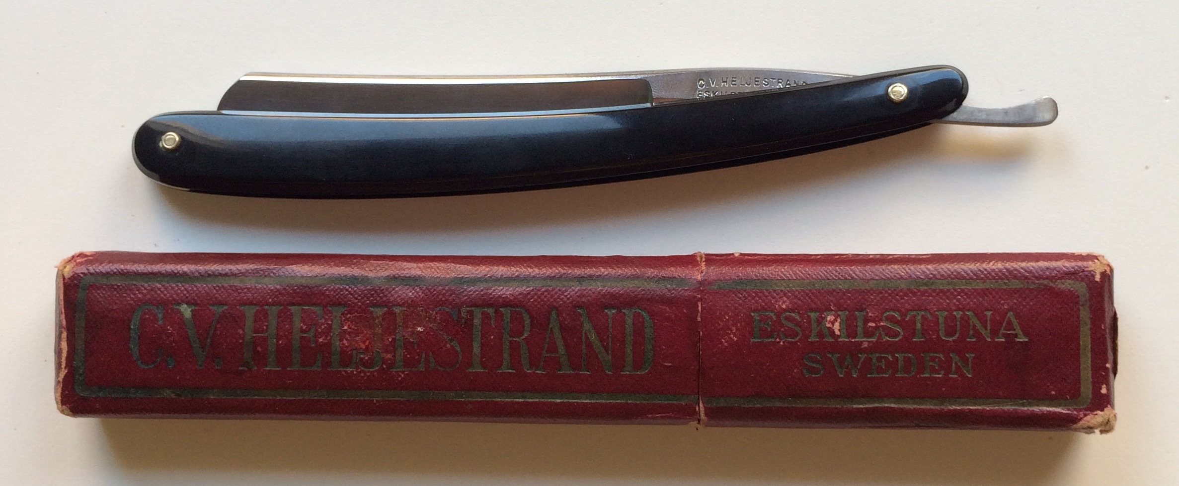 C.V. Heljestrand Eskilstuna n°24. Está impecable, sin marcas de ningún tipo, ni siquiera de carbono. Tiene una anchura de 1,43cm por lo que es una 9/16. Esto es un juguete, que cuenta con uno de los mejores aceros de todos los tiempos y es muy pero que muy difícil encontrar una en este estado de conservación y con la caja original. A esta le pasa lo contrario que a las otras y es que se me queda pequeña. Precio 80€
