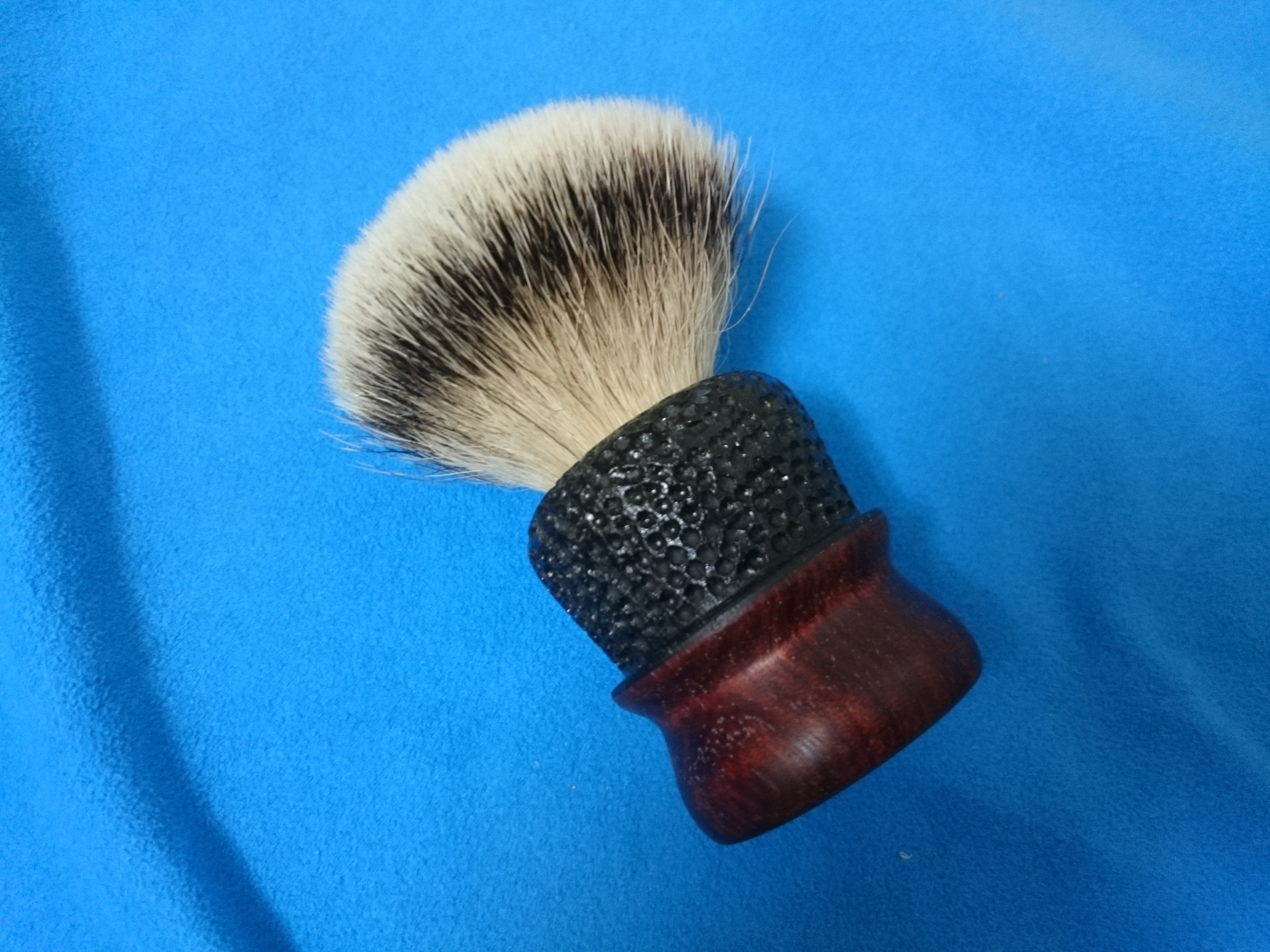Pongo en venta esta magnífica brocha, en madera de bubinga y wengue (macizo, no teñido), montada con un no menos magnífico Premium Silvertip de 26x48 mm Fan.