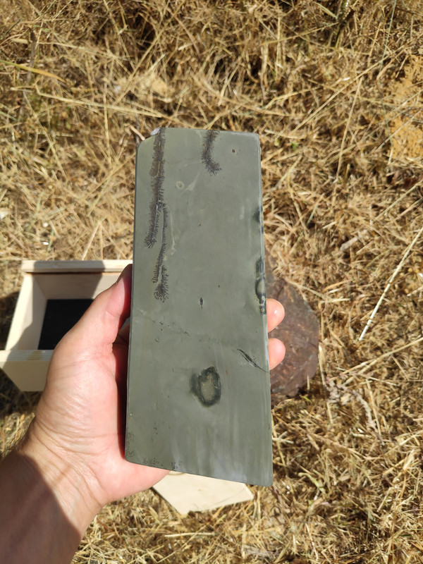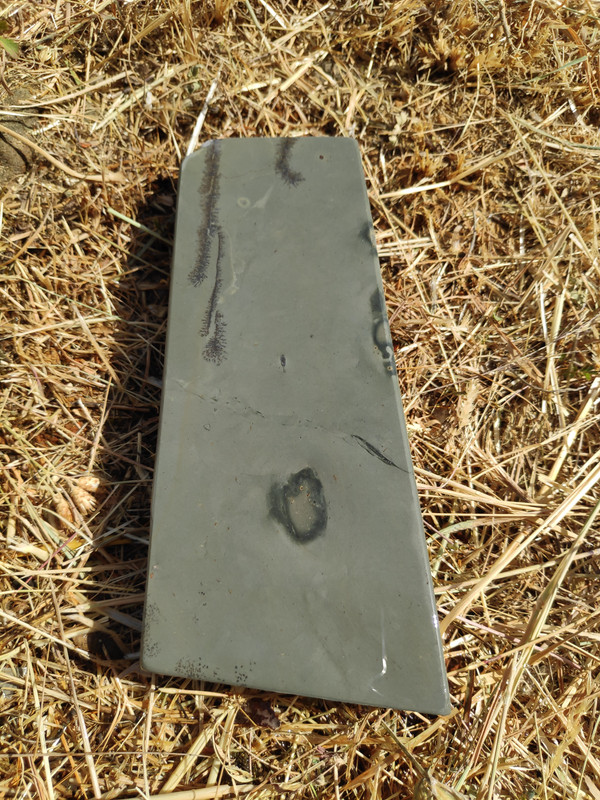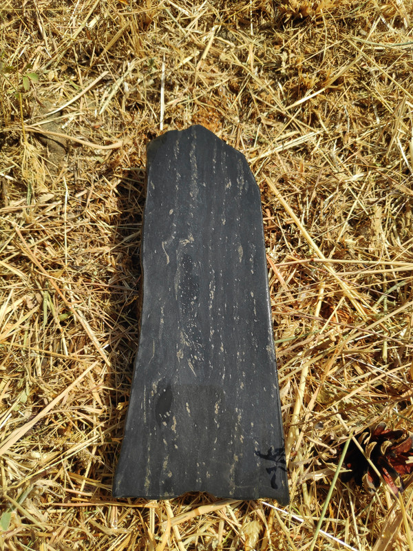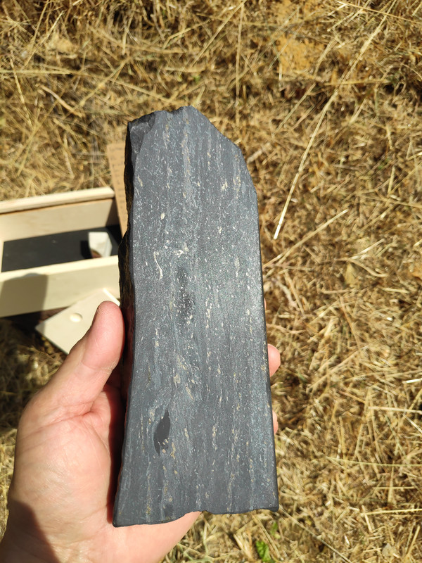Además, tiene el mismo brillo y dureza que las últimas wakō que he hecho. Es quizá un pelo más dura y refleja el sol exactamente igual que estas, también tiene algo de cuarcita y en este caso esas manchas blancas son de cuarzo. Pero vamos, que es una pizarra es una pizarra, con su estructura laminar incluida grietas y demás