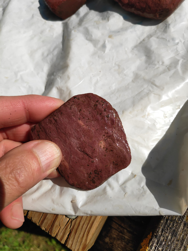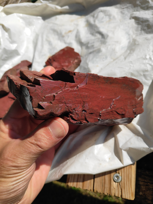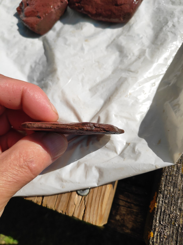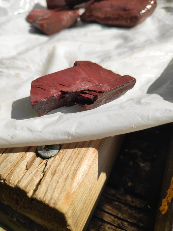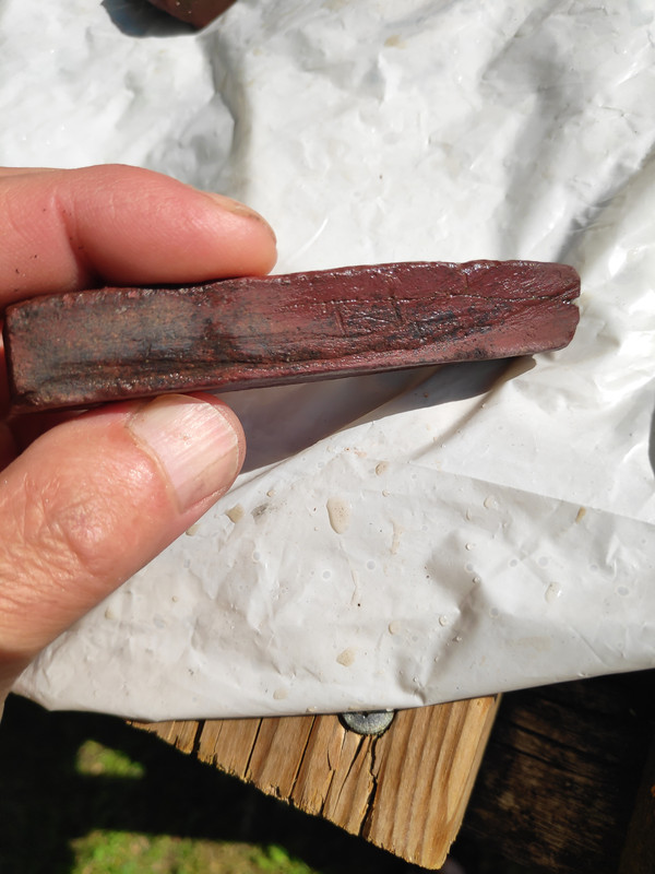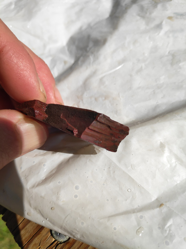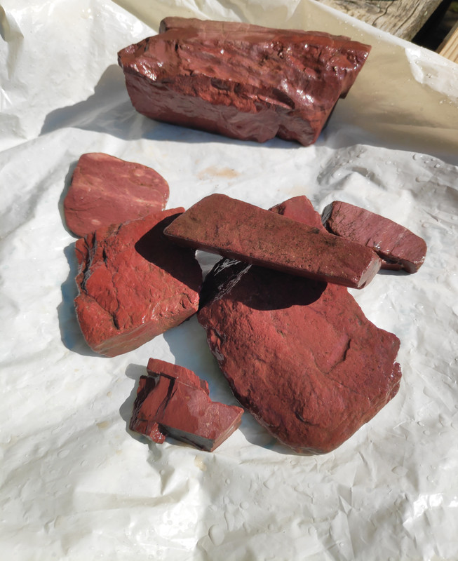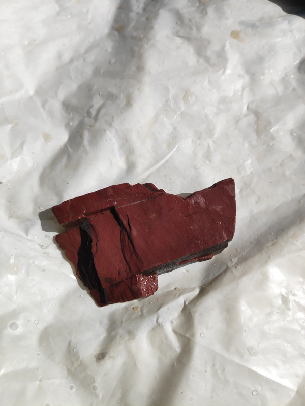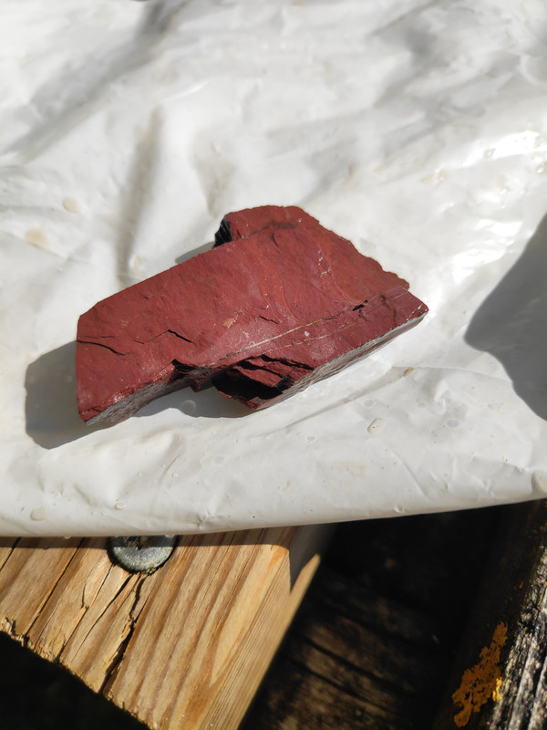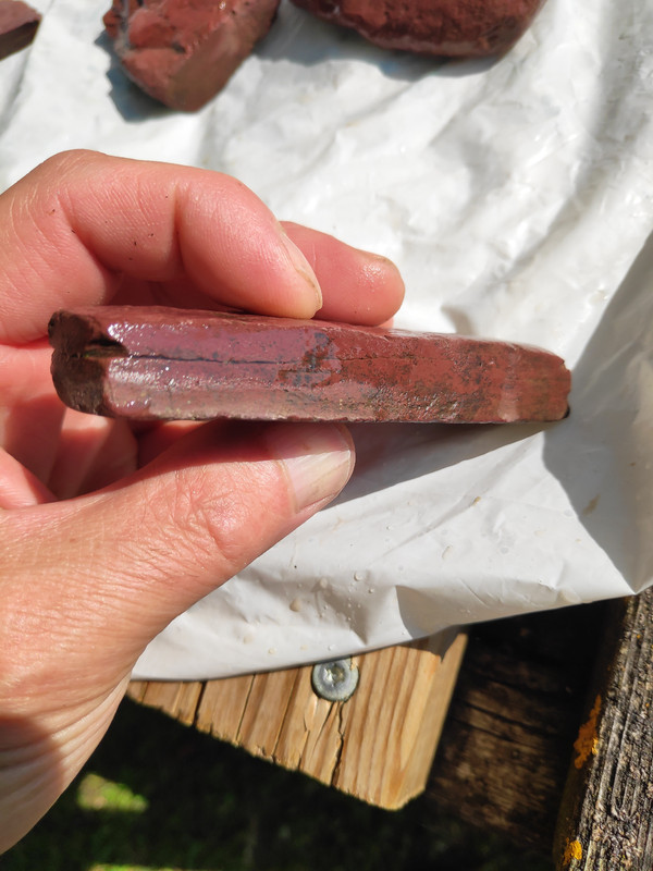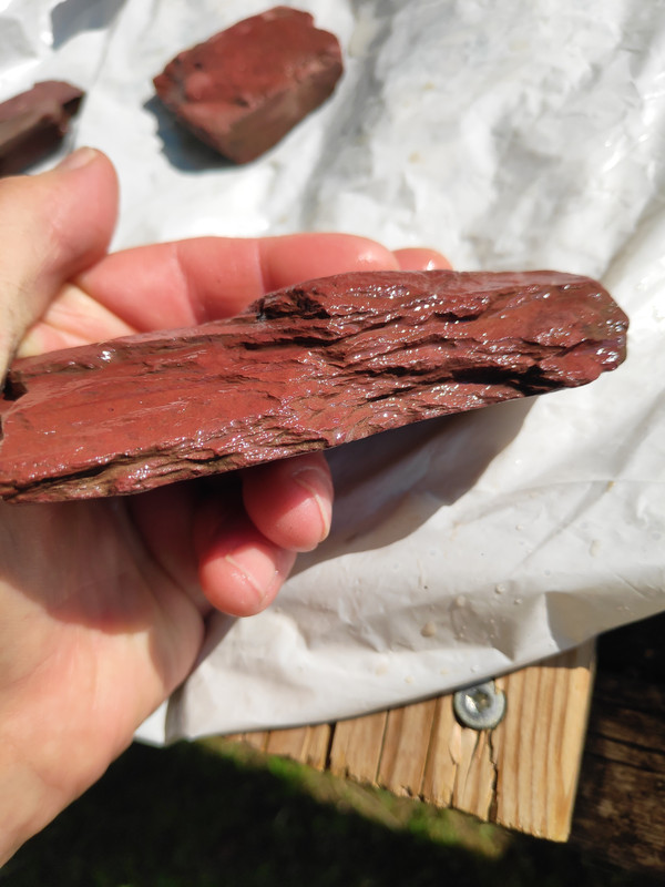 Estructura laminar propia de las metamórficas, ausencia de grandes cristales (descartamos cuarcita), barrillo gomoso como las wakō, soltaba polvo como las wakō. Estoy al 97,8 ℅ de que es pizarra roja, pero he pedido la opinión de un geólogo y así salimos de dudas.