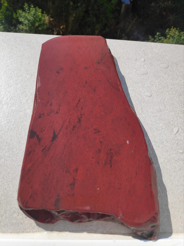 Esa piedra tiene pinta de ser Jaspe rojo. La superficie bien pulido es como cristal.