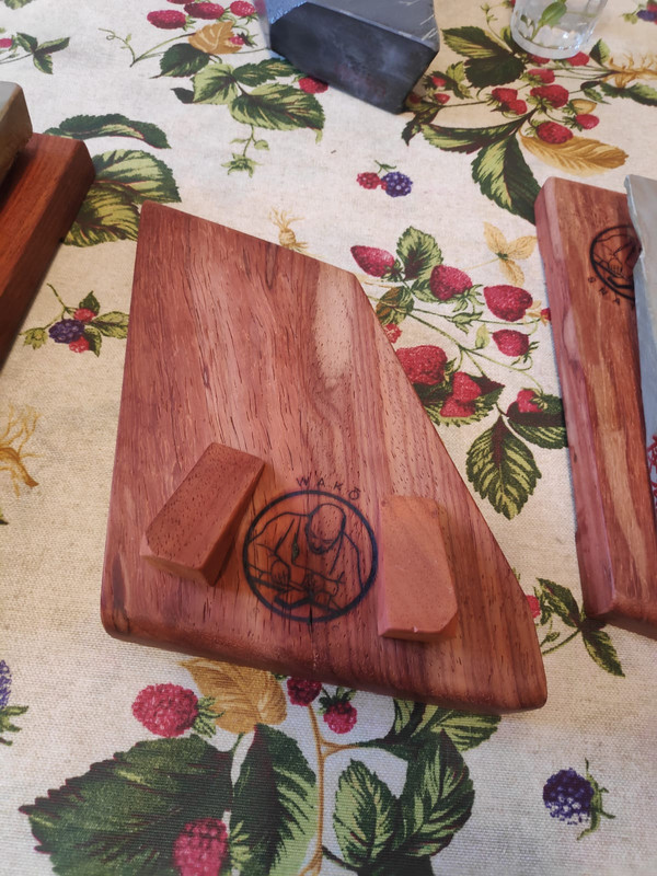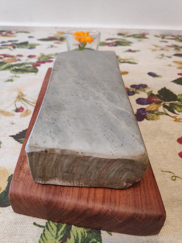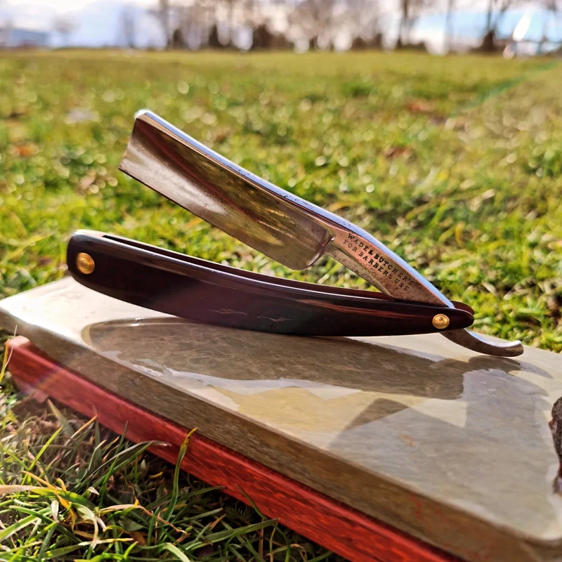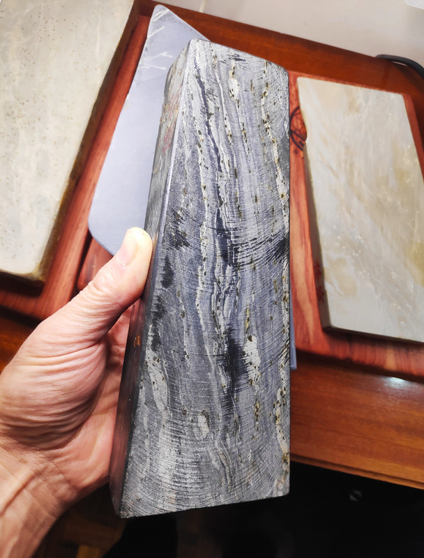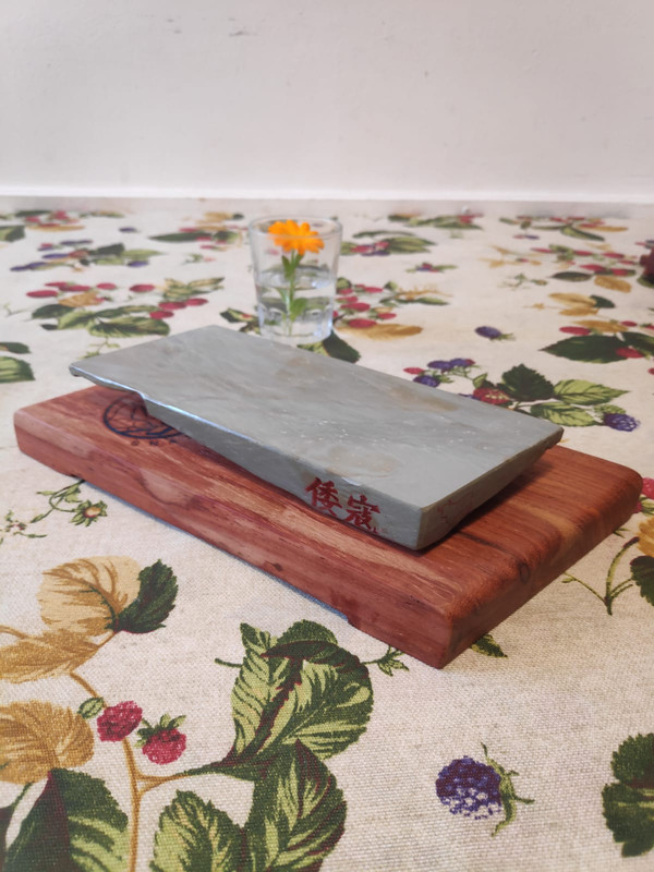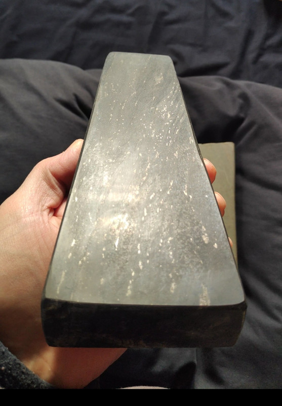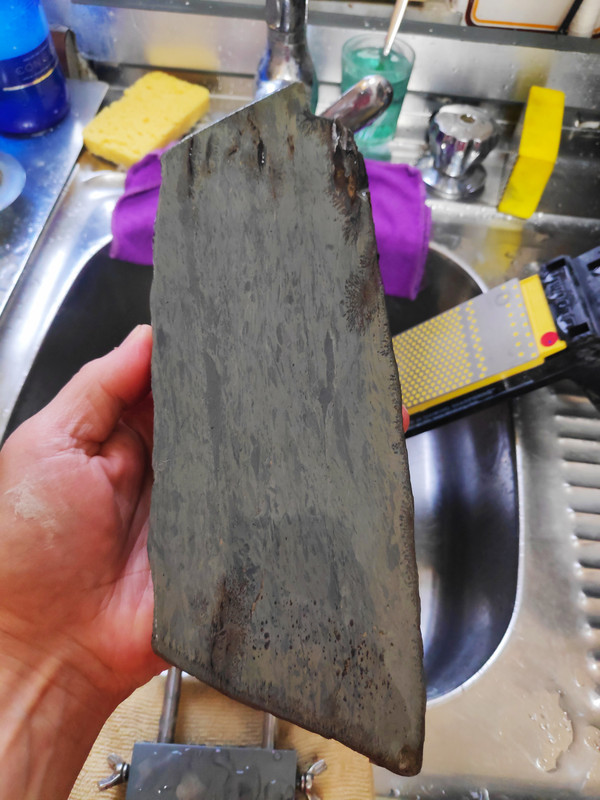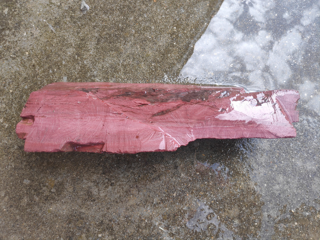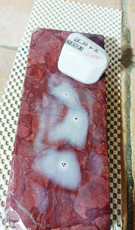 Queda archivado el caso de la pizarra roja en el que fui a darme un paseo, a despejarme, y encontré unos pedruscos rojos que parecían pizarras, que tenían incluso unas partes oscuras que brillaban como la pizarra, qué todo el valle eran aguas ferruginosas y que todo eso se mezcló desembocando en una ilusión, en un Oasis. Luego llegó el geólogo, me vió viendo claramente un oasis y me dejó ahí, disfrutando de mi oasis. Luego llegó un americano, y me aseguró que eso era un jaspe (la opción de Cinabrio cobró vida de nuevo) y que además él lo usaba para afilar también, pero no barberas. Que quita rayas en los biseles y yo comprobé que era cierto. Pero a mí no me interesaba. Hice pruebas con ella, pasé hasta una navaja muy muy muy bien afilada con las wakō y que no empeoró mucho, la verdad. Pero, lamentablemente debo decir que es una piedra semipreciosa, destinada más a lo hornamental que al afilado. Es un jaspe. Tengo 10kg de jaspe en bruto en casa que me llevé para hacer piedras de afilar, obviamente en mi más completa Ignorancia, y que no pienso subirlas de nuevo a menos que alguien me deje un caballo. La piedra para cuchillos va de cine, es tan dura que saca barro con todo, y en este sentido cobra vida la piedra. Quita rayas si, no deja rayas no, pero es muy lenta y con el peso de la navaja dando pases igual tienes que estar 3 días para llegar a dónde llega una wakō en 20 min, no interesa. Para cuhillos ojo, es tan dura que puedes imprimir toda la fuerza que quieras sin dañar la piedra lo más mínimo y pule biseles de cine. Yo no la usaría para navajas pero si como una última piedra de finalización de cuchillos, pero claro, es tan tan tan rara para esto, que sería casi una piedra más de colección que otra cosa.