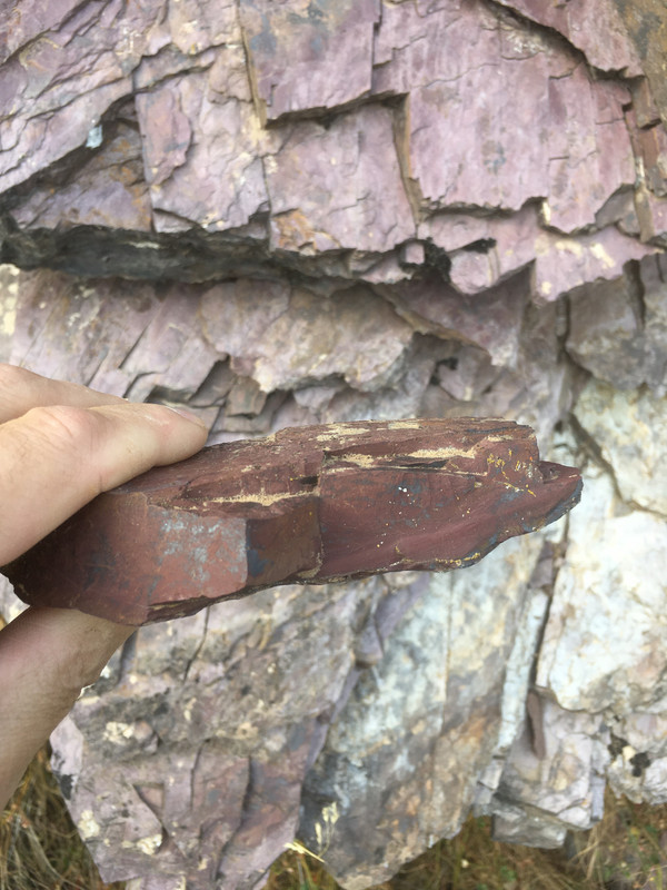 Como bien dijo @Cinabrio, es un jaspe. Pero … ¿por qué aquel geólogo de la zona dijo lutita o pizarra? ¿No sabe reconocer un jaspe? Vió una clara oportunidad de desviar mi atención de aquel yacimiento de jaspe poco conocido y temió que fuera expoliado. Claro, él no sabía nada de mis intenciones hasta que se las presenté en persona, le llevé la piedra pulida convertida en piedra de afilar y claro, se quedó más tranquilo y si, ya me lo reconoció. Me pidió discreción sobre aquel lugar y yo le dije que no se preocupase.